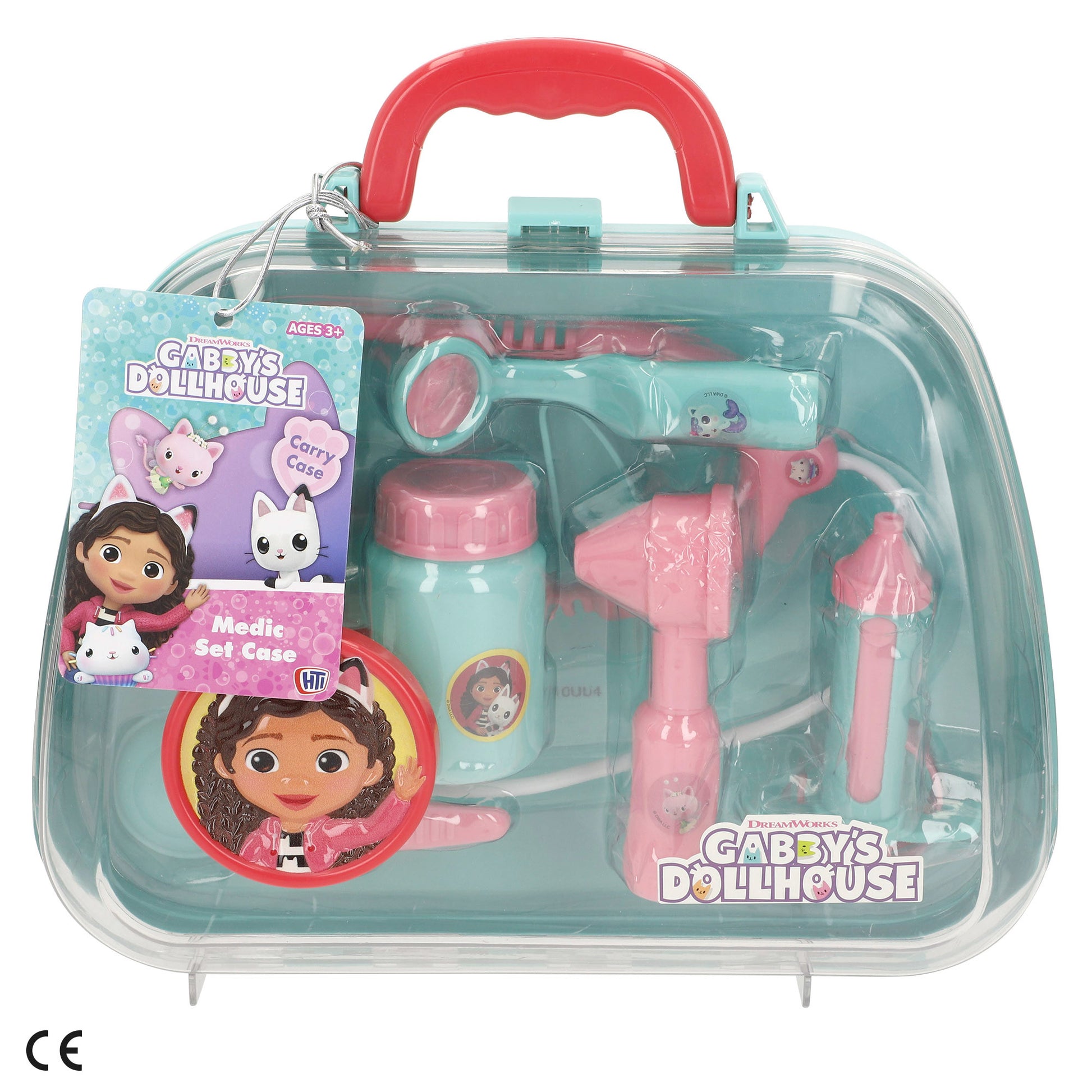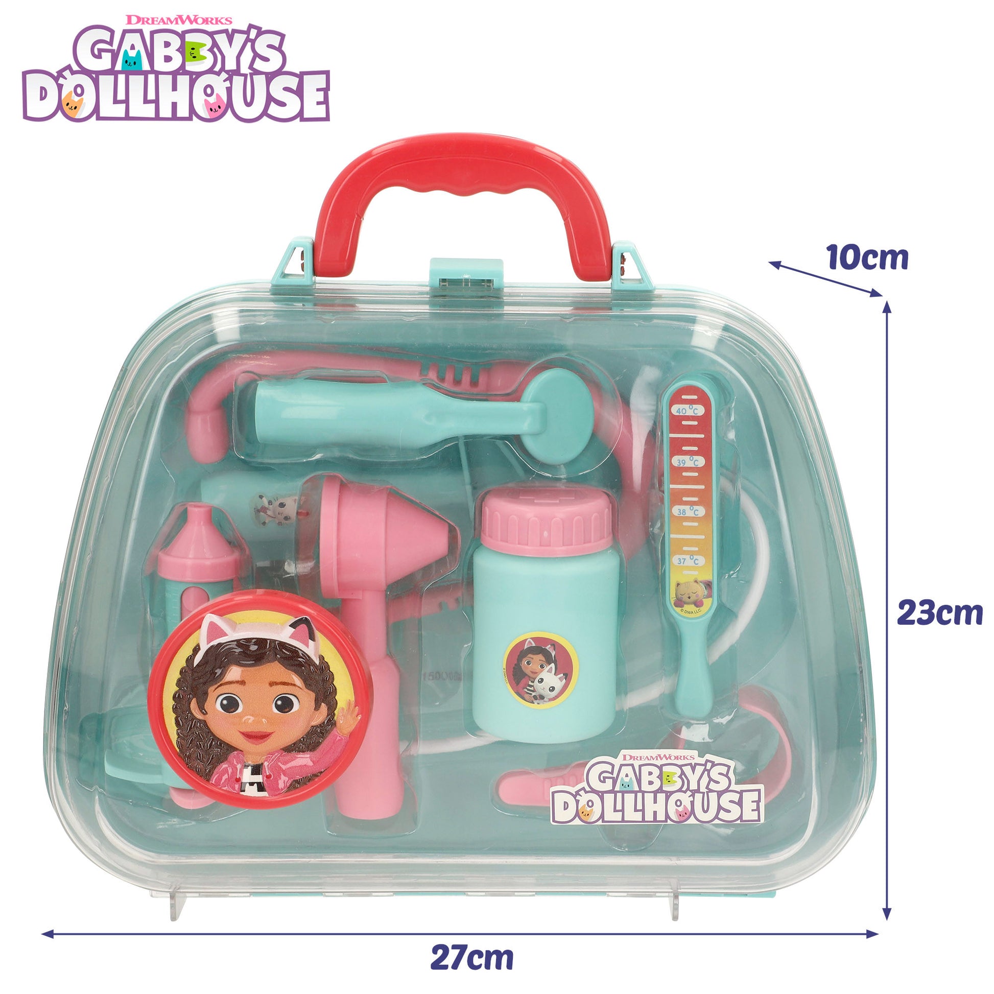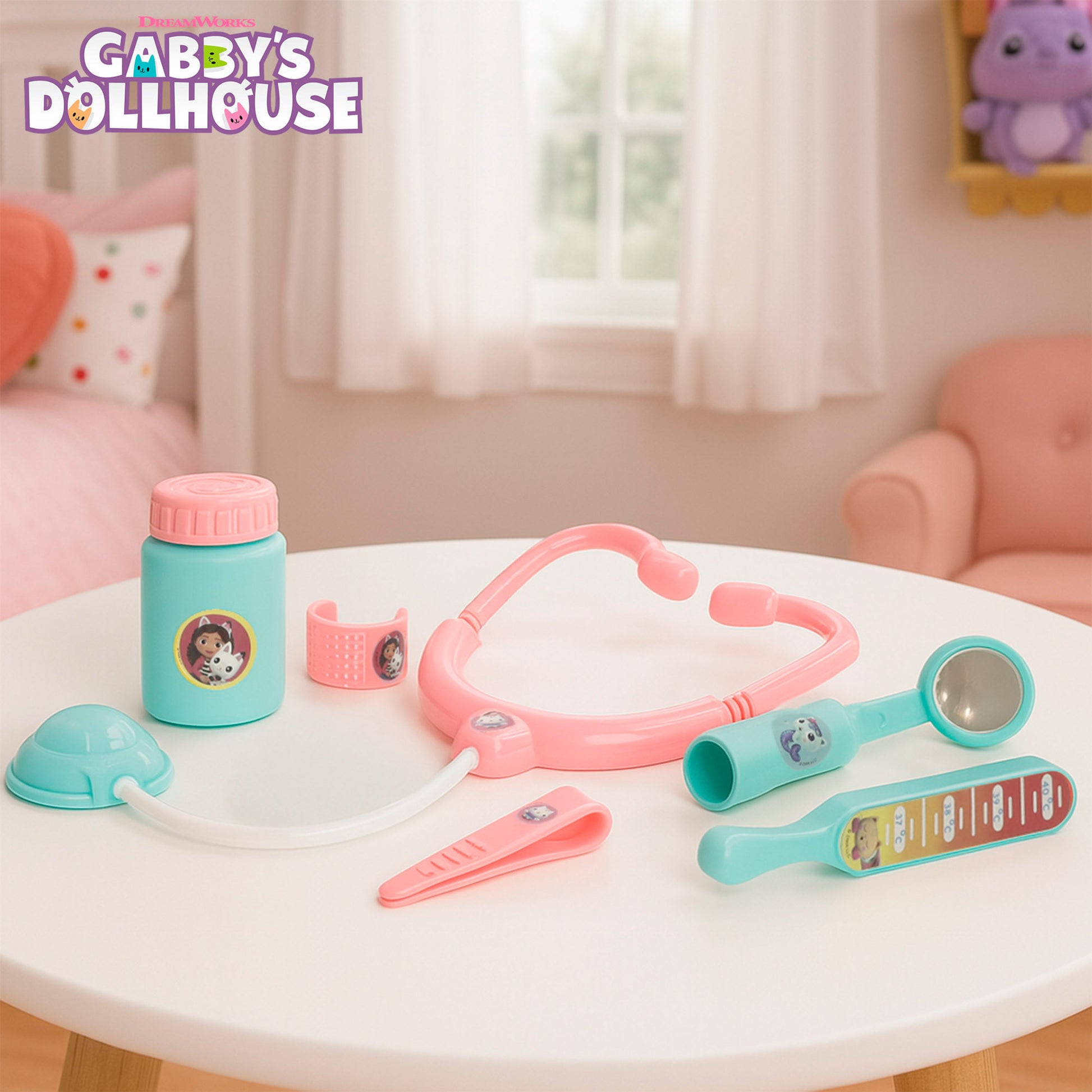 Incluye un estetoscopio, un termómetro, una jeringuilla, un martillo de reflejos, un frasco de medicina y otros accesorios médicos, todos en colores pastel y decorados con ilustraciones de Gabby. El maletín se abre fácilmente y permite guardar todo dentro para llevarlo donde quieras.
