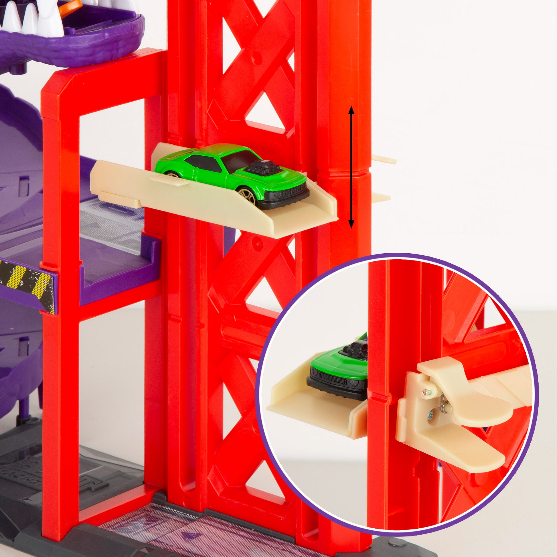 El Dragon Pit no es solo una pista de coches, ¡es un desafío lleno de velocidad, acción y fantasía! Con su ascensor para coches y su lanzador integrado, los vehículos descienden por el circuito en espiral para enfrentarse al peligro del dragón. ¡Atrévete a pasar por sus feroces mandíbulas y conviértete en el ganador de la carrera!