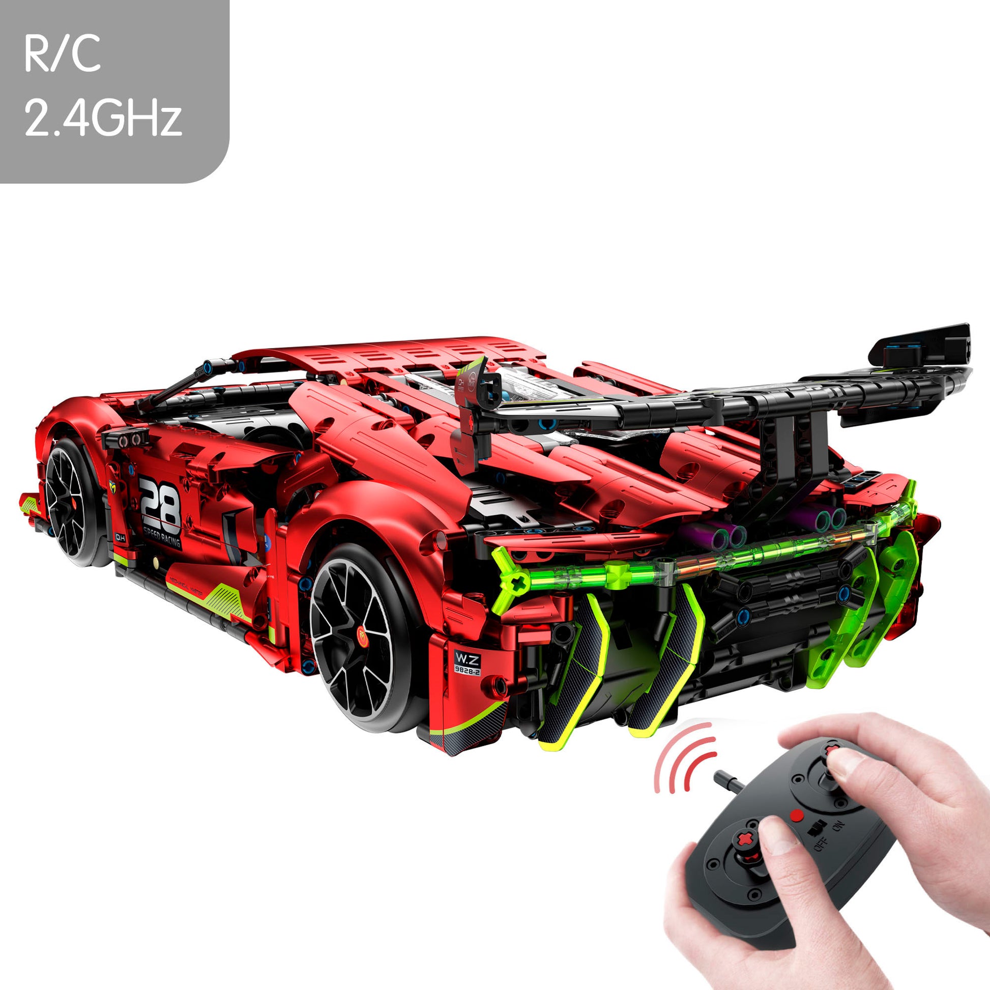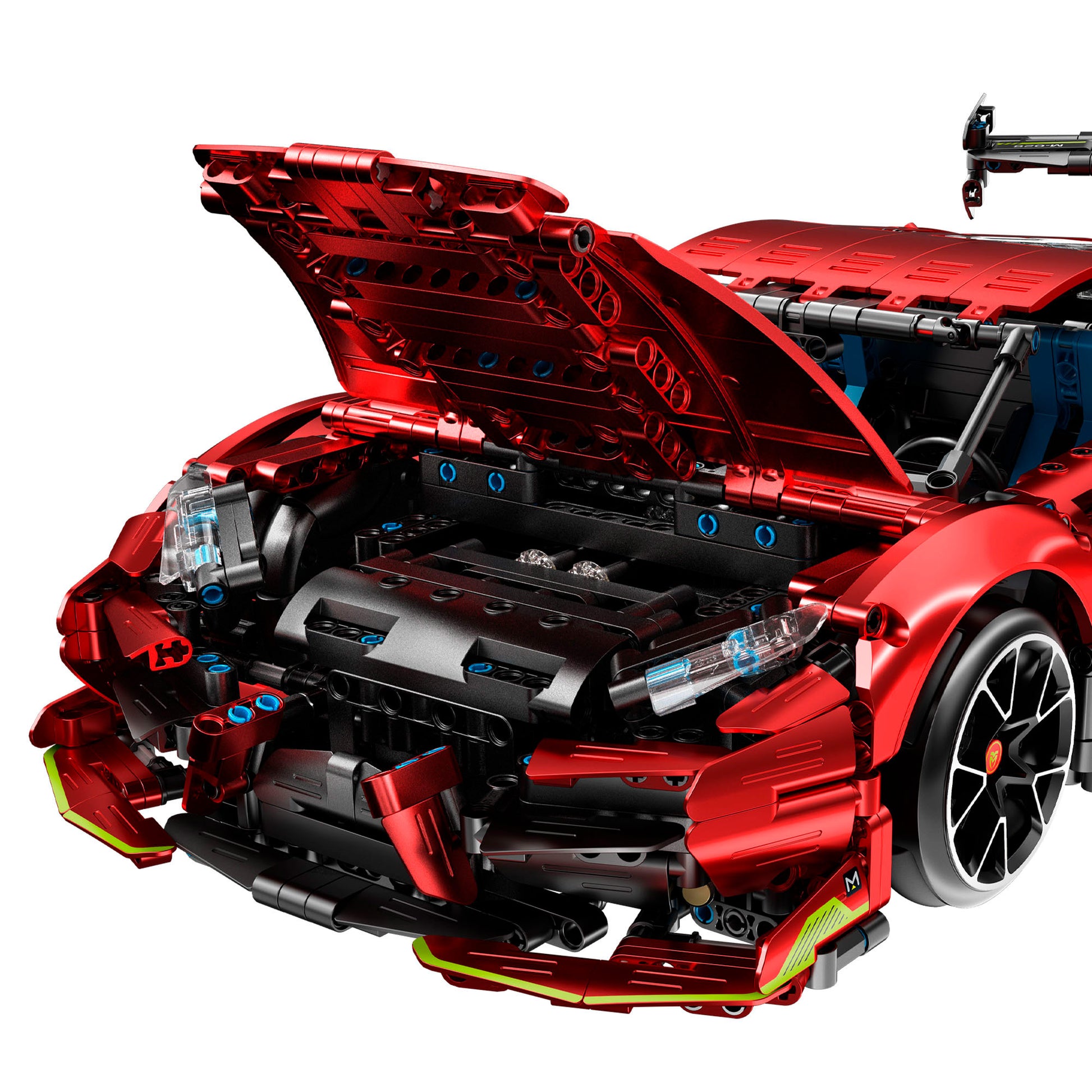 El juego de construcción incluye 1835 piezas que forman un coche de 51,5 x 23 x 13,5 cm con un diseño aerodinámico y detalles realistas, un mando radiocontrol 2,4 GHz para dirigirlo (también se puede pilotar con un móvil mediante la APP complementaria con opciones avanzadas como giroscopio, simulador de conducción y programación), un motor de alta velocidad 59#, cuatro motores adicionales black golden, dos adaptadores 250# y un core box de programación 226#. Además, incluye manual de montaje paso a paso con ilustraciones que facilitan su ensamblaje.