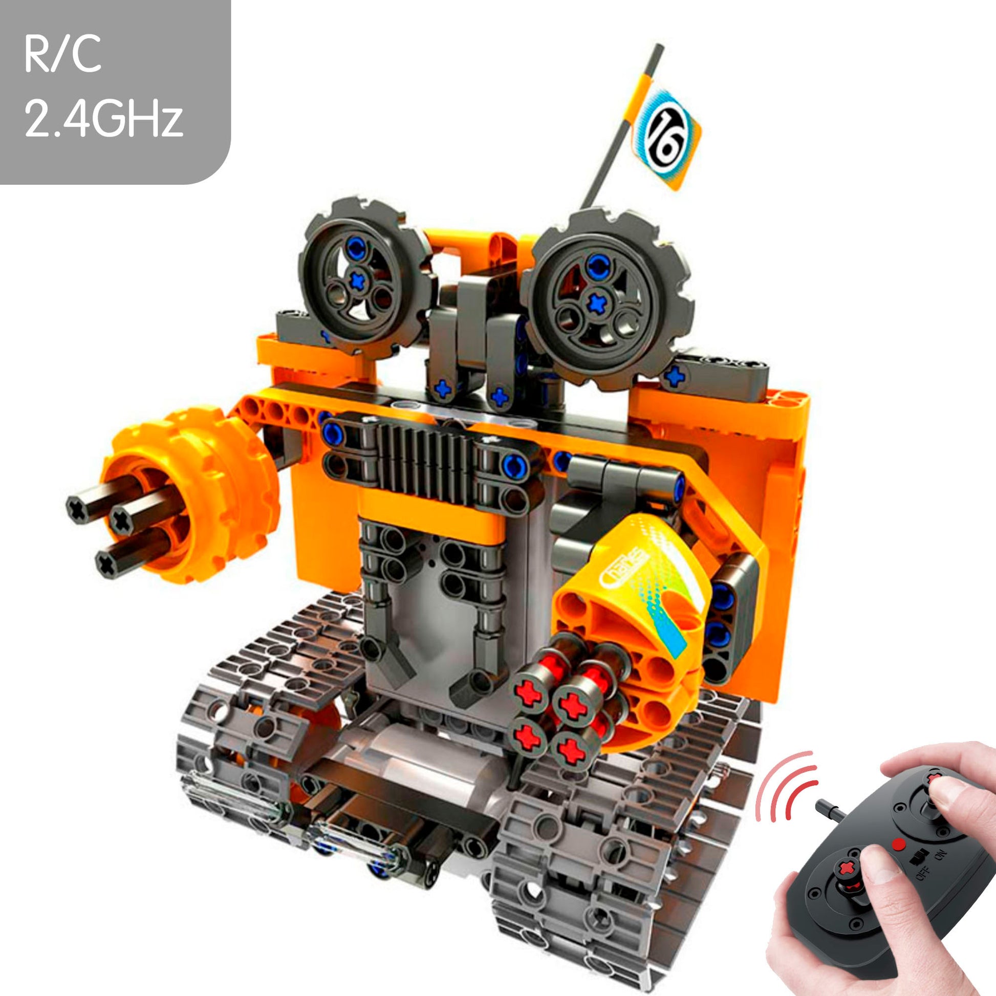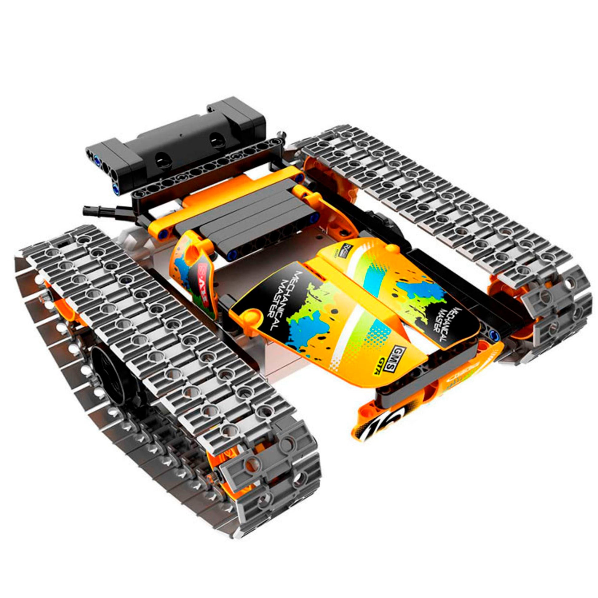 Incluye 392 piezas de construcción de alta calidad para ensamblar el modelo en tres versiones diferentes, un sistema de orugas para mayor tracción, un control remoto de 2.4 GHz para conducción precisa y un manual de instrucciones detallado con ilustraciones que guía el montaje paso a paso.