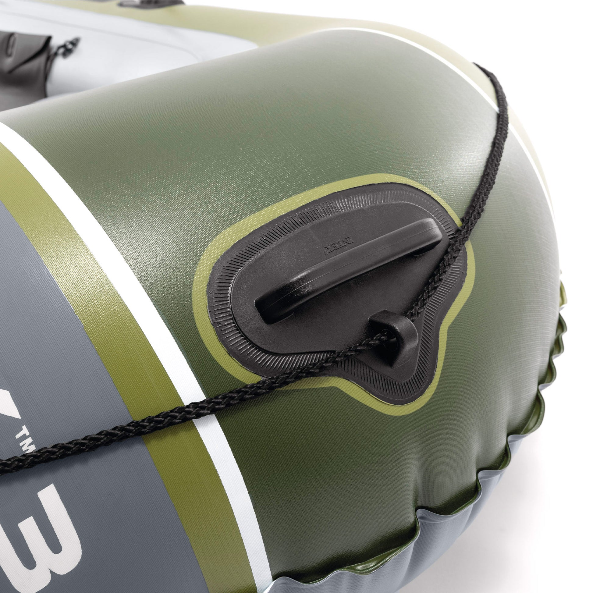 Con la barca Seahawk 3 tenéis todo lo necesario para salir a navegar: 2 remos de aluminio desmontables, 2 asientos hinchables, una bomba manual de hinchado, horquillas y fijaciones para colocar los remos en los laterales, cuerda de agarre que rodea toda la barca y asa en la proa para moverla mejor desde la orilla. Además, incorpora dos apoyos y dos agujeros para colocar cañas de pescar, un práctico soporte trasero para motor (motor no incluido), una bolsa para herramientas u objetos personales y un parche de reparación para pequeños imprevistos. Solo hay que hincharla, montar los remos y empezar a navegar.