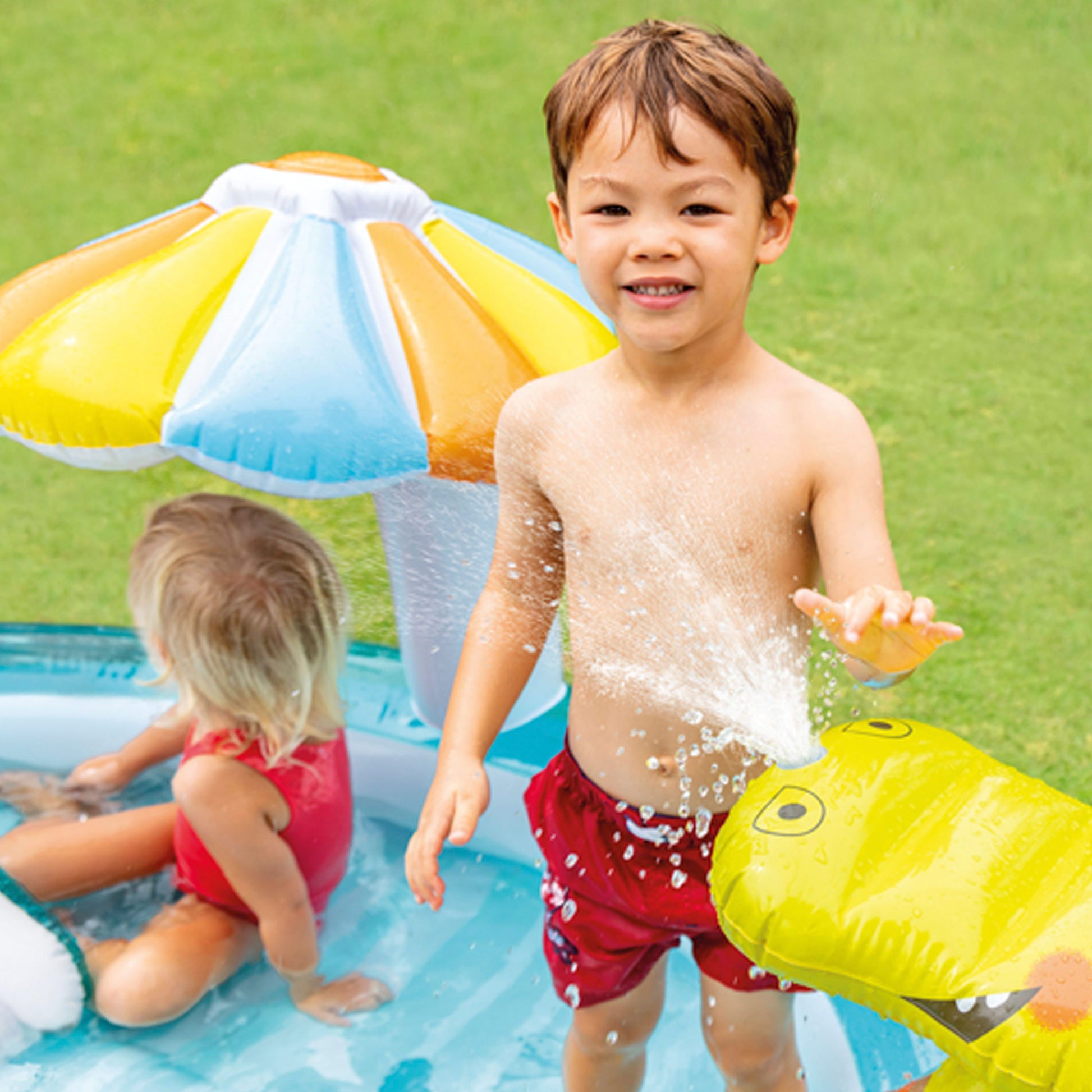 ¡Sumérgete en la diversión del verano con el fantástico centro de juegos acuático INTEX! Con un encantador diseño marino y un agradable cocodrilo hinchable, este centro se convertirá en el juego favorito de los más pequeños. ¡Se divertirán en un mundo lleno de emocionantes aventuras submarinas!