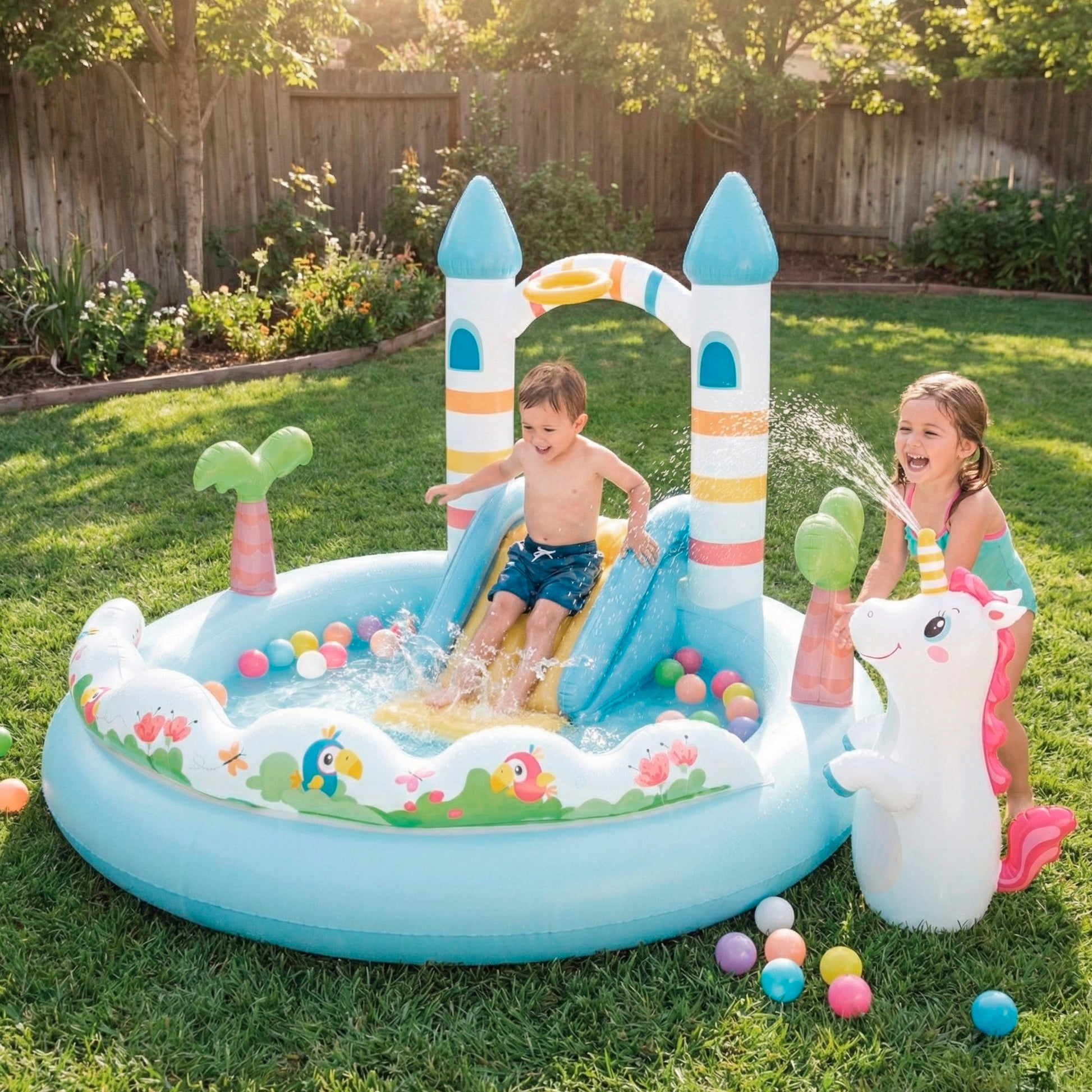 Este centro de juegos hinchable INTEX transforma el jardín en un auténtico castillo mágico lleno de agua y diversión. Su diseño circular con torres, palmeras y un simpático unicornio invita a los peques a bañarse, deslizarse por el tobogán y crear historias fantásticas mientras se refrescan durante los días de calor. El arco con pulverizador añade un extra de juego al conectar la manguera y dejar caer el agua como si fuera una pequeña cascada.