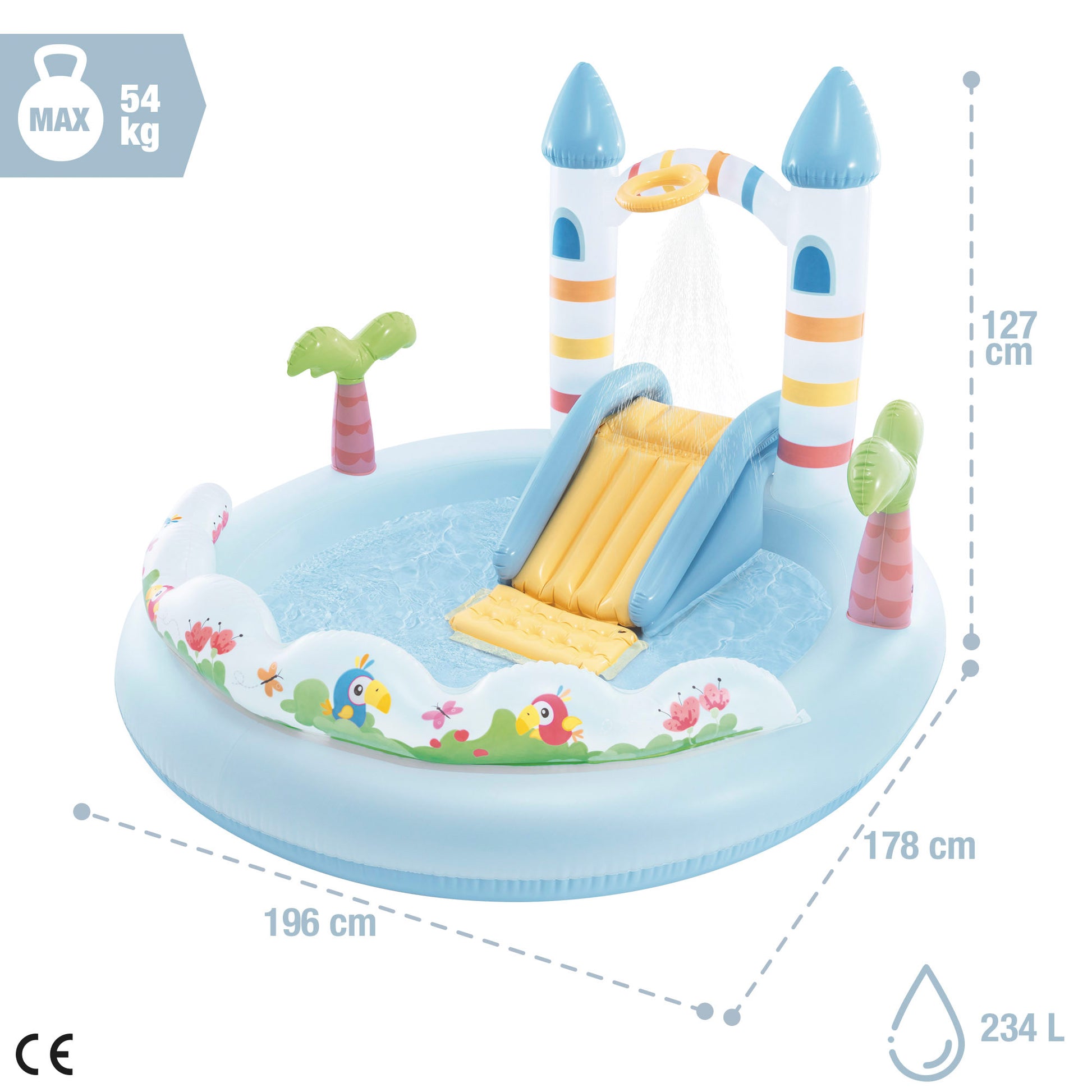 La piscina tiene una capacidad de 234 litros de agua y soporta un peso máximo de 54 kg. Sus medidas son 196x178x127 cm y está recomendada para niños a partir de 2 años, siempre bajo la supervisión de un adulto. Está pensada para un uso recreativo en exteriores como jardines o terrazas, ofreciendo un espacio divertido para disfrutar del verano.