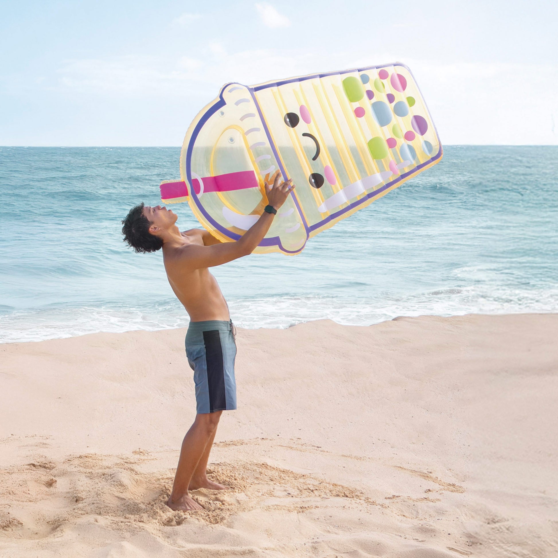 ¡Una colchoneta tan divertida como refrescante! Disfrutar del verano con un toque original y desenfadado con este hinchable con forma de vaso de té de burbujas. Con unas medidas de 173x99x20 cm, tiene capacidad para 1 persona y soporta hasta 100 kg. Está fabricada en PVC y cuenta con una superficie cómoda para tumbarse al sol o flotar con tranquilidad en la piscina, en la playa o incluso en el río. Su diseño en tonos pastel incluye una pajita rosa, tapa transparente y perlas de tapioca de colores que le dan un aspecto de bebida real. Recomendada a partir de 14 años, incluye parche de reparación. ¡Conviértete en el centro de todas las miradas este verano con esta colchoneta tan dulce!