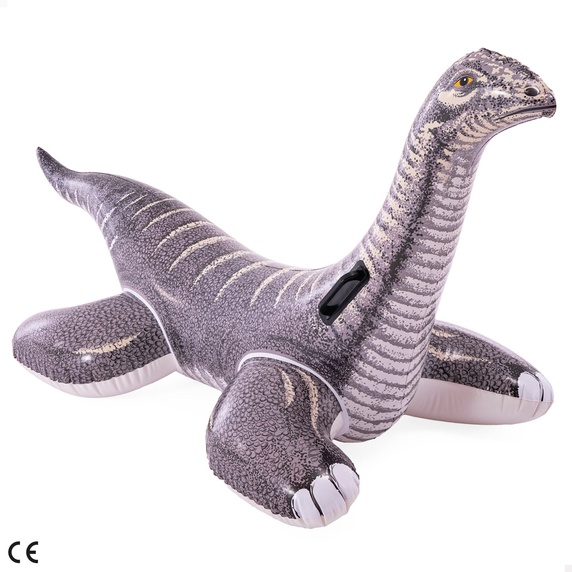 Este hinchable es un gran brontosaurio al que podrás subirte para flotar por la piscina. Tiene forma alargada, cuello largo y cola, y viene con asas para agarrarte bien cuando el agua se mueva
