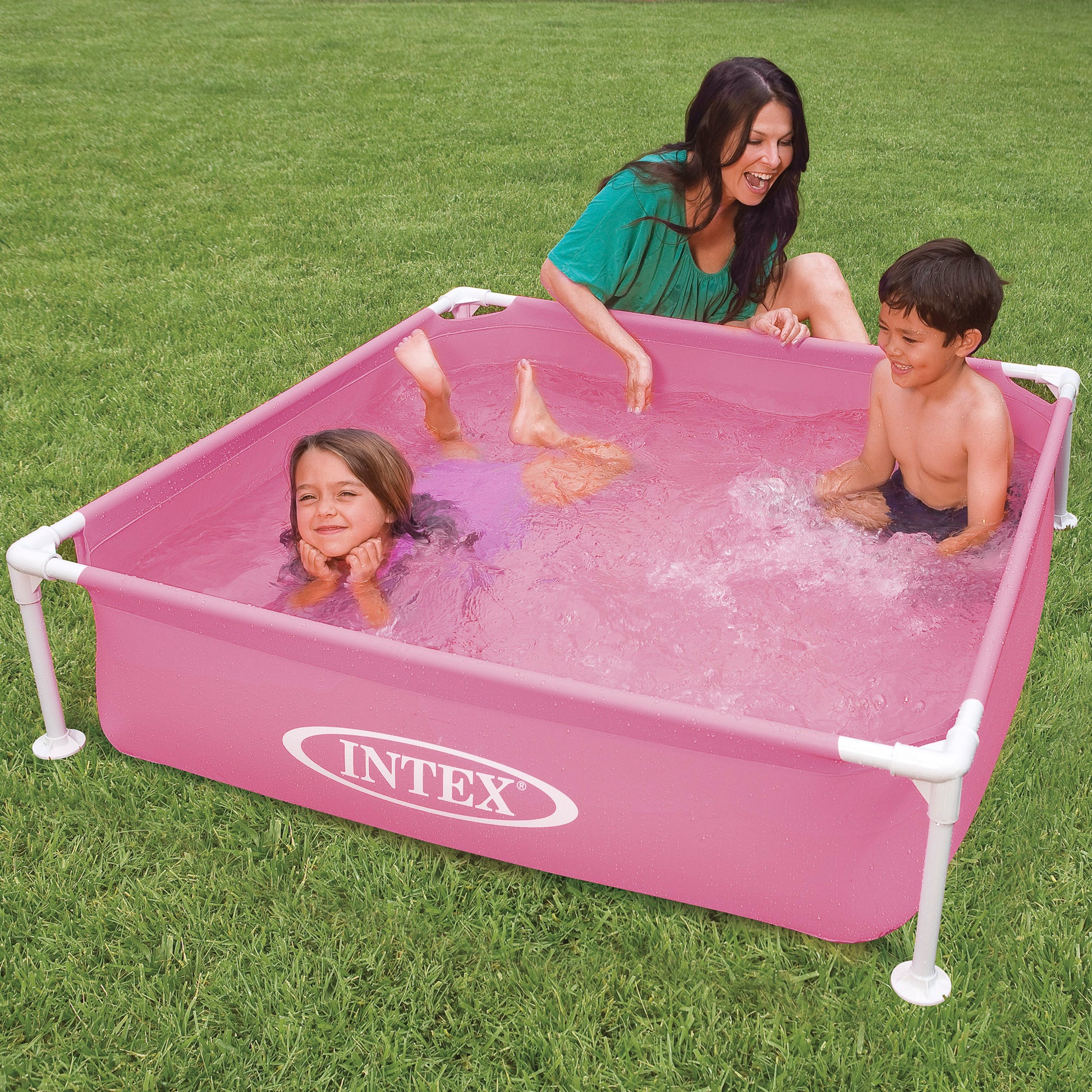 Piscina desmontable infantil cuadrada Mini Frame INTEX color rosa con medidas 122x122x30 cm y capacidad para 342 litros de agua. La lona de la piscina está fabricada de material de 3 capas SuperTough (PVC-Poliéster) para una mayor resistencia frente a perforaciones y la estructura tubular es de acero metálico galvanizado resistente y duradero. Los bordes superiores incorporan espuma acolchada para una mayor seguridad durante el baño. Además, incluye tapón de vaciado conectable a una manguera (no incluida), para desaguar en la zona más apropiada de tu jardín y un parche de reparación para arreglar posibles poros o arañazos. Se instala fácilmente, en 10 minutos aproximadamente, y se recomienda su montaje sobre una superficie lisa, estable y nivelada.
