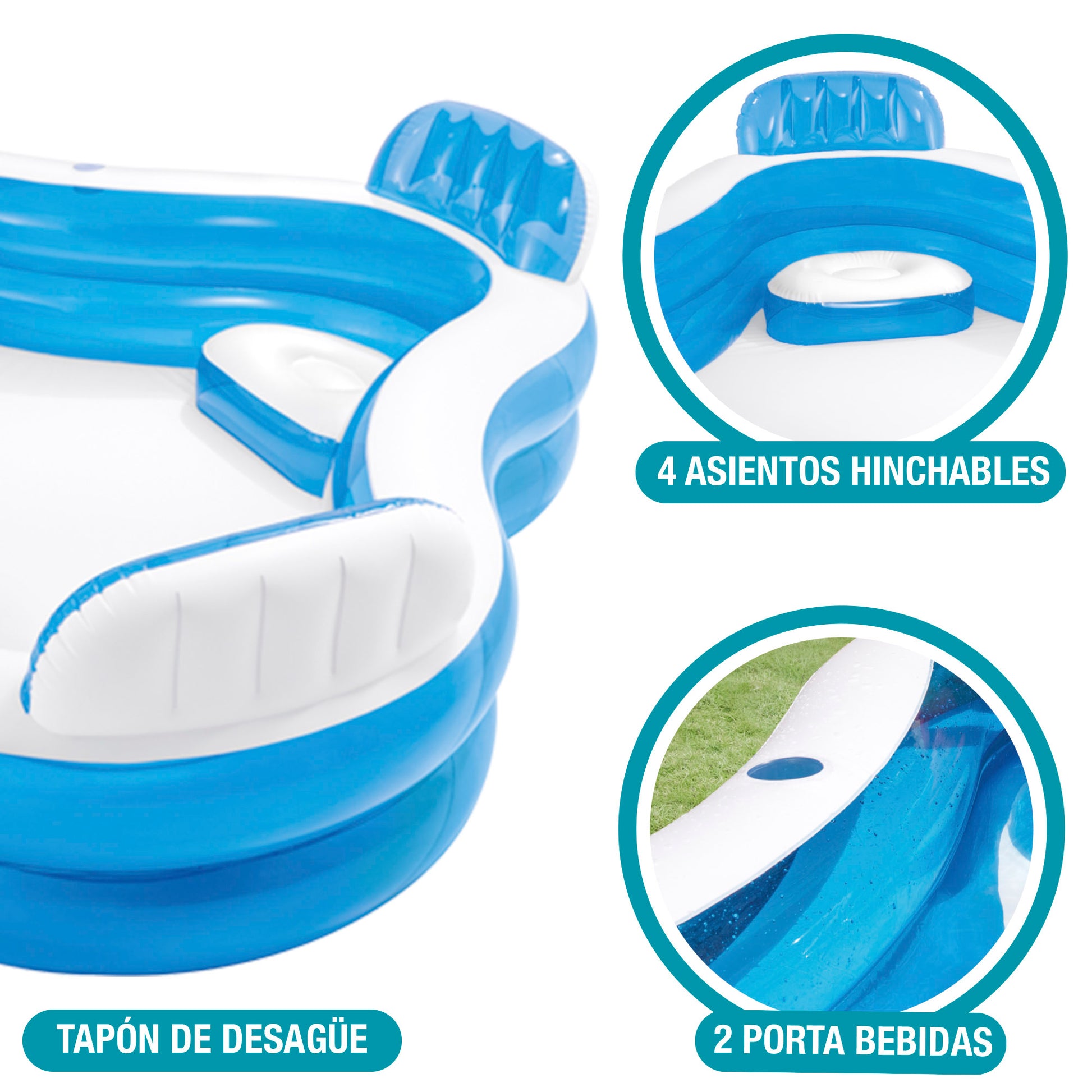 Aprovecha al máximo tu jardín o terraza con esta piscina hinchable familiar Intex. Con unas medidas de 229x229x66 cm, la piscina tiene capacidad para 990 litros de agua. Lleva 4 asientos hinchables con respaldo incorporados en la piscina, así como 2 portabebidas y tapón de vaciado. Fabricada en PVC de gran calidad y grosor de 0,33 mm. Incluye kit con parche de reparación.