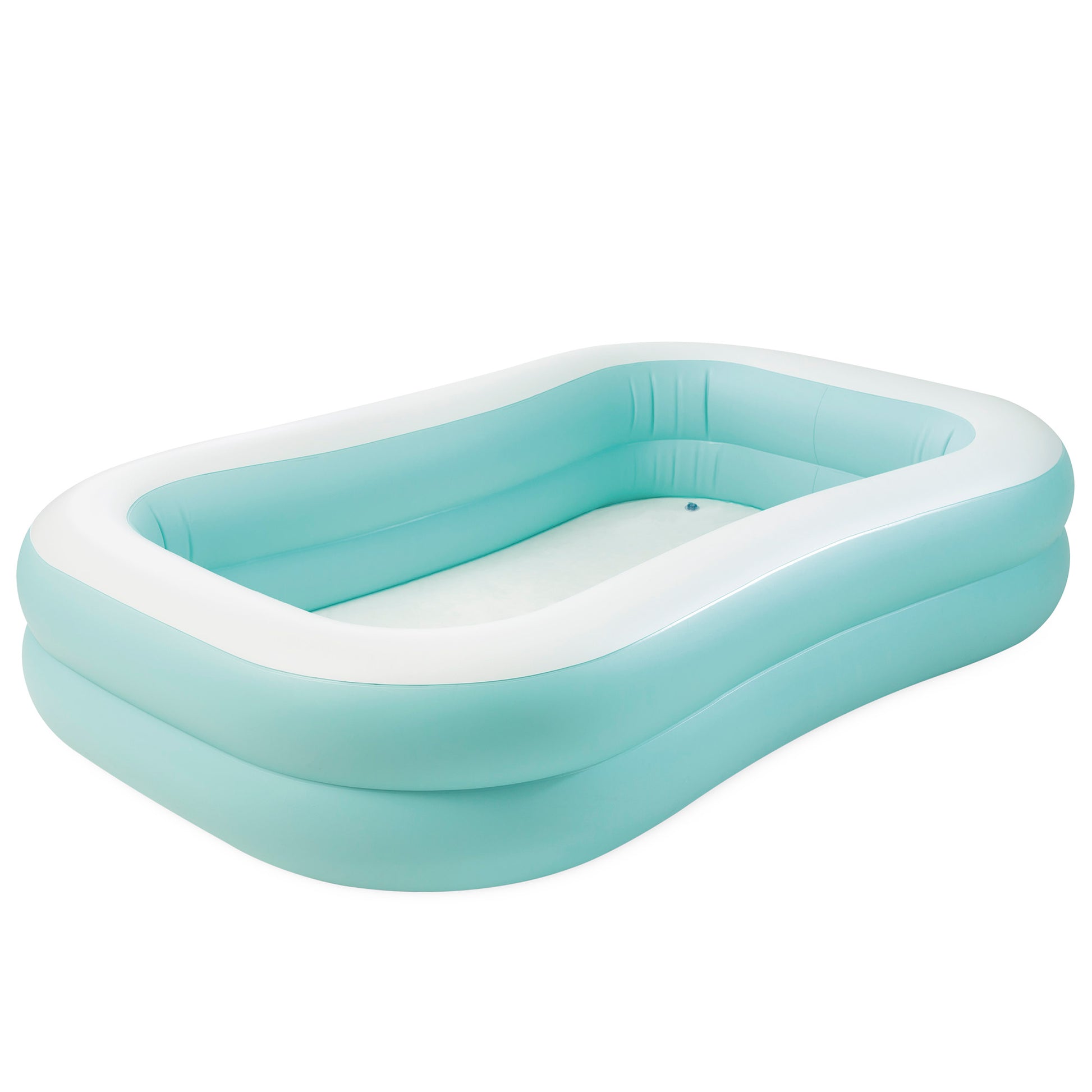 Piscina hinchable familiar INTEX en color azul. La piscina mide 229x152x48 cm, y tiene capacidad para 600 litros de agua. Su forma rectangular con 2 aros gruesos y anchos la hace ideal para el baño en familia (2 niños a partir de 3 años y 1 adulto). La piscina tiene tapón de drenaje para facilitar su vaciado e incluye 1 parche de reparación.