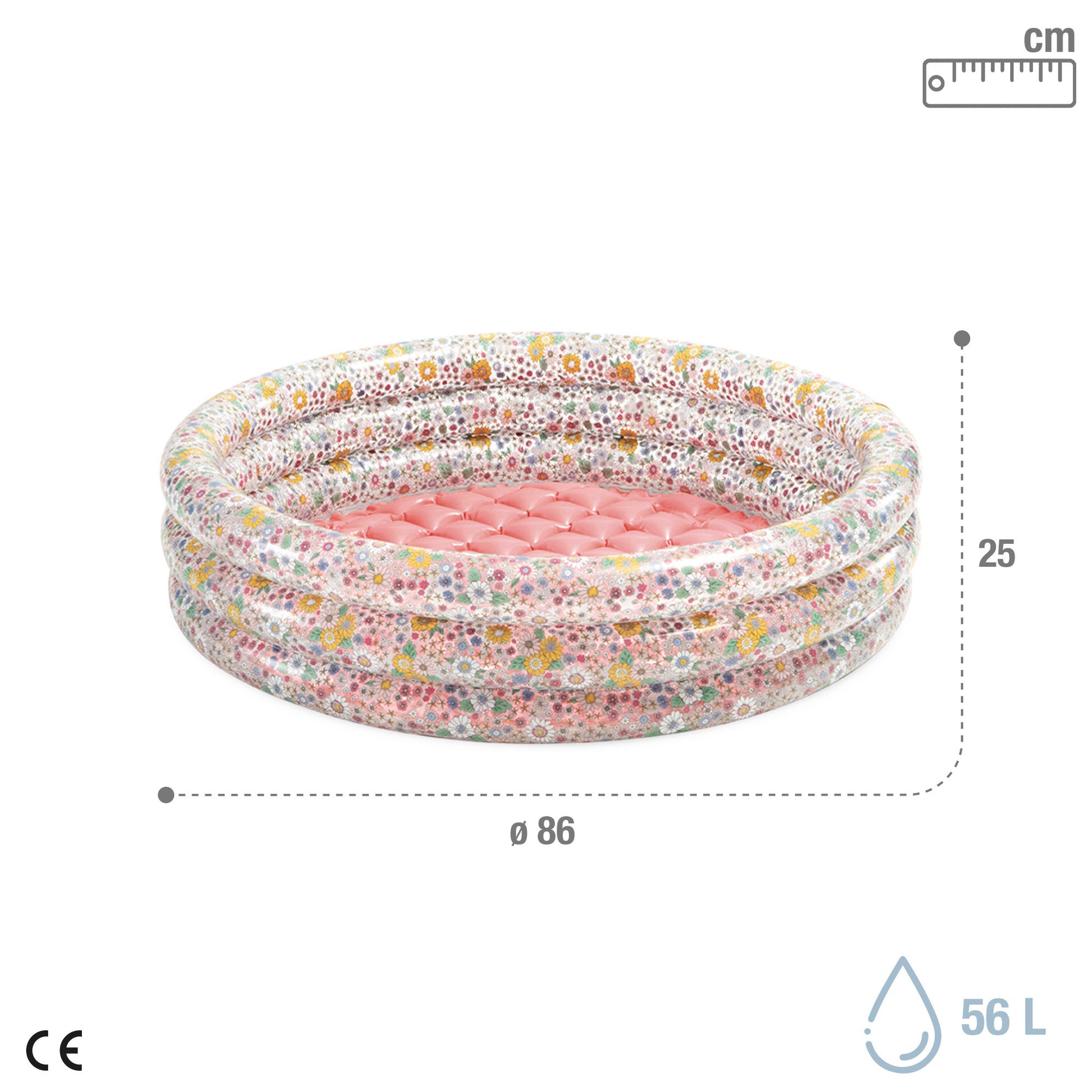 Piscina redonda de 86 cm de diámetro y 25 cm de altura, con tres aros hinchables que forman una estructura estable y cómoda para los más pequeños. El interior cuenta con un suelo hinchable que proporciona una base acolchada ideal para sentarse o chapotear con total seguridad.