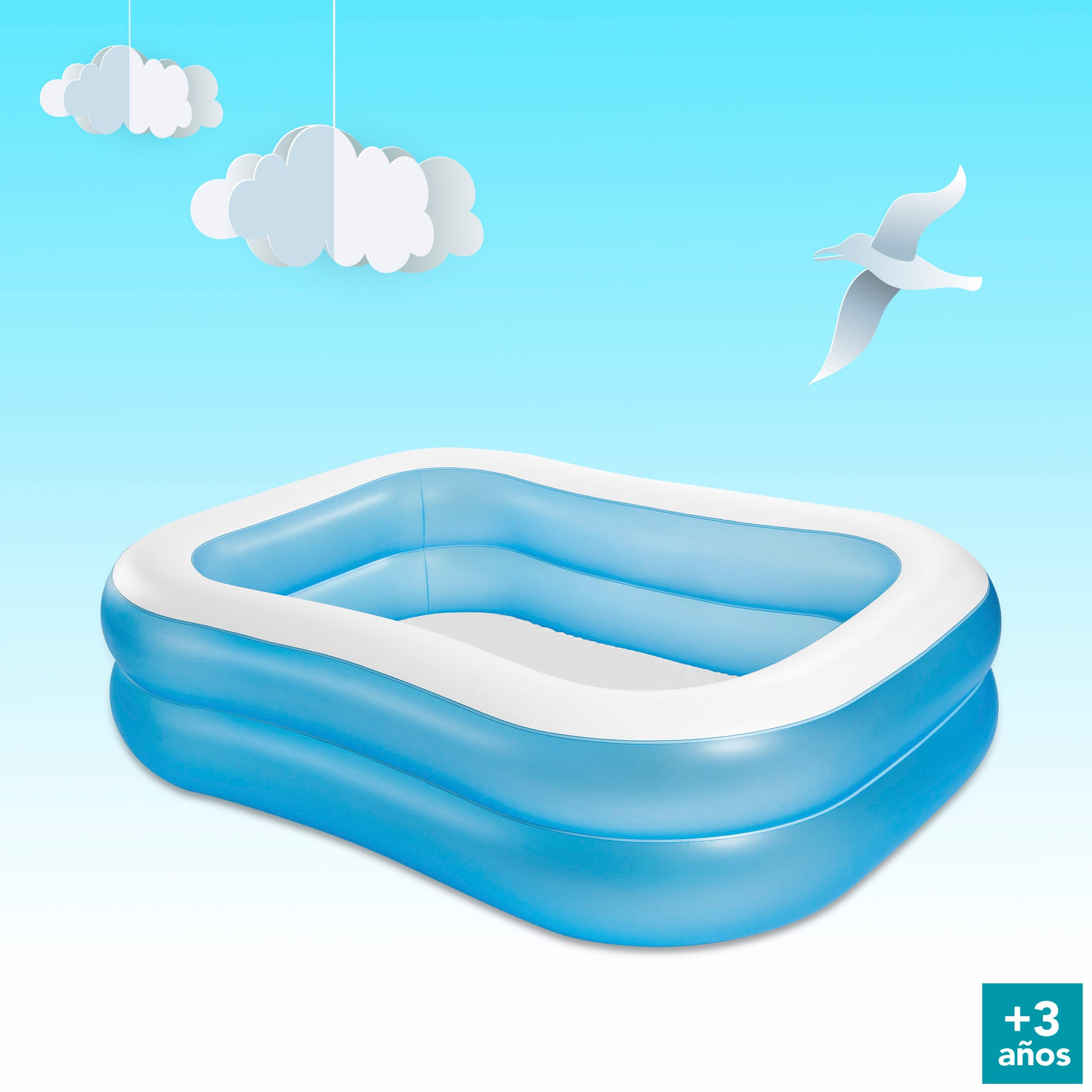 ¡A refrescarse en familia con la piscina hinchable INTEX rectangular! Tiene unas medidas de 203x152x48 cm y capacidad para 540 litros/agua (llenar a una altura máxima de 34 cm). Está fabricada de vinilo resistente con un grosor de 0,30 mm y su estructura cuenta con dos anillos hinchables. Las paredes exteriores e interiores son de color azul y la superficie y el suelo color blanco. Incluye 2 cámaras de aire con doble válvula para un poder hincharla y deshincharla rápidamente. También cuenta con tapón de desagüe para vaciarla en una zona alejada de la casa. Está diseñada para ser usada por 3 niños a la vez y se recomienda para mayores de 3 años siempre bajo la supervisión de un adulto. Incluye parche de reparación para poder reparar pequeños poros o arañazos.