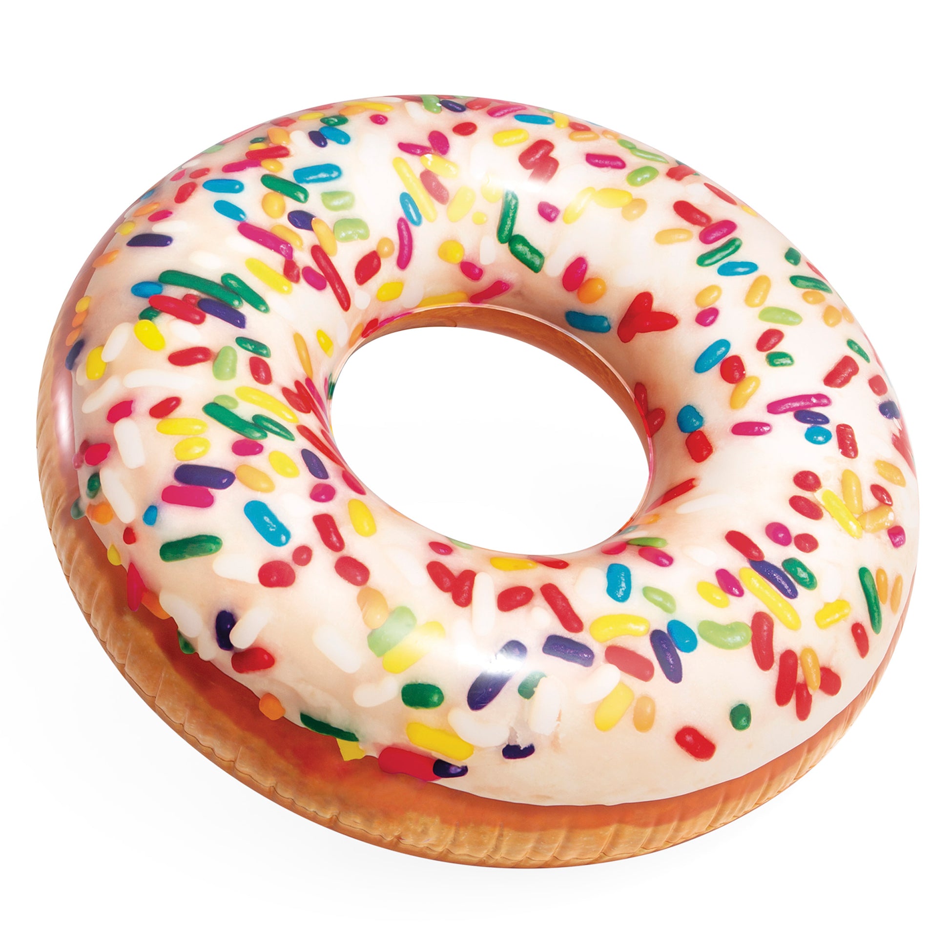 Rueda hinchable Intex con diseño de donut blanco e impresión fotorrealista quesimula glaseado adornado con fideos de colores. Fabricado en vinilo de gran calidad y grosor de 0,25 mm. Dimensiones: 99 cm de diámetro exterior y 39 cm de diámetro interior. Recomendado para una persona mayor de 9 años. Incluye kit de reparación con parche para posibles roces o pinchazos.