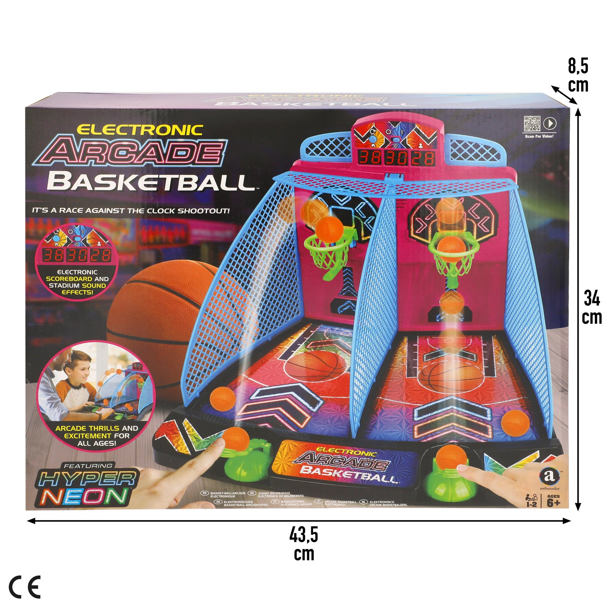 Estructura multicolor con temática neón, líneas geométricas, 2 canastas, 2 lanzadores, 6 pelotas y marcador digital doble. Laterales de rejilla para mantener las bolas en juego y tablero inspirado en un salón recreativo.