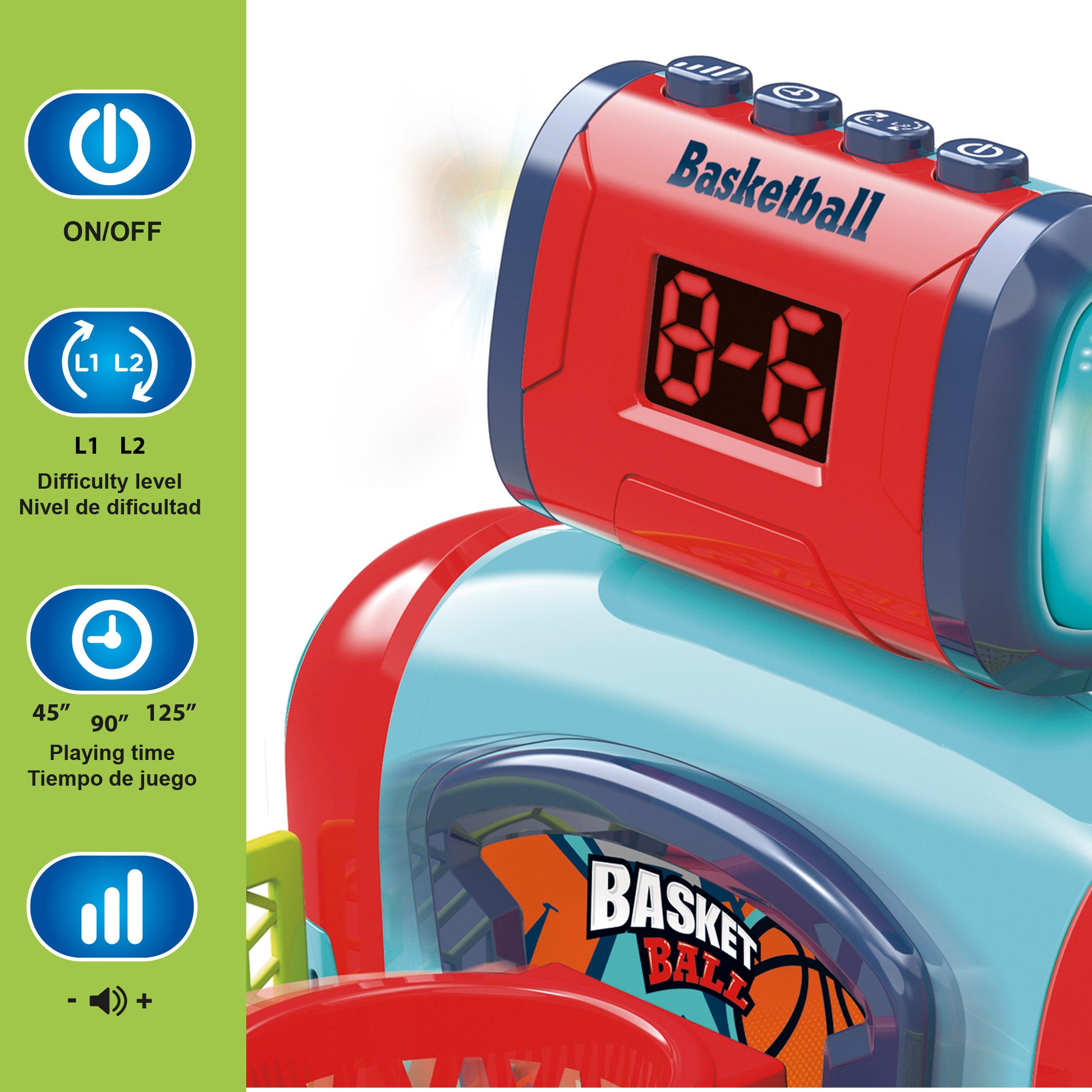 Este juego viene equipado con todo lo que necesitas para vivir un duelo épico: 2 canchas de baloncesto con marcadores electrónicos para seguir cada punto en tiempo real, 6 pelotas (tres para cada jugador), lanzadores que facilitan tiros precisos y protecciones laterales para que las pelotas no se salgan. Además, cuenta con 4 botones de control para encender/apagar, ajustar el nivel de dificultad (1 o 2), seleccionar el tiempo de juego (45, 90 o 125 segundos) y regular el volumen.