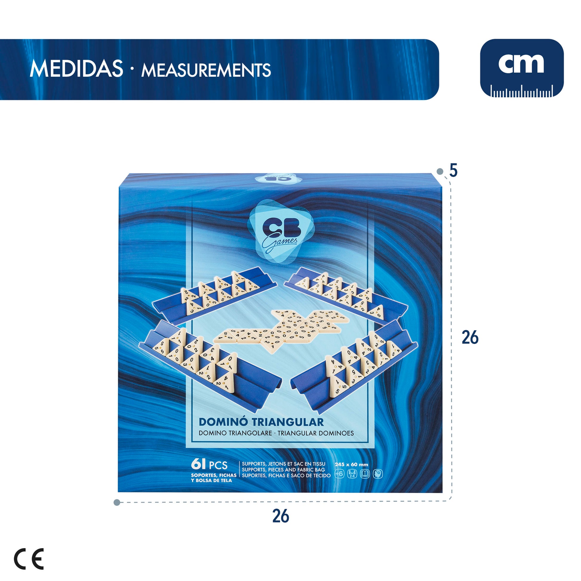 ¡Con el dominó triangular de CB Games no tendrás tiempo de aburrite! ¿Conseguirás agotar tus fichas antes que tu adversario? Tiene un tamaño de 24,5x6 cm e incluye 60 piezas triangulares con números, una bolsa que sirve como mezclador y 4 soportes. Este juego de mesa desarrolla la imaginación, el aprendizaje, el razonamiento y la socialización al jugar y compartir momentos con amigos y familiares. Juego de mesa recomendado para jugar de 2 a 4 jugadores.