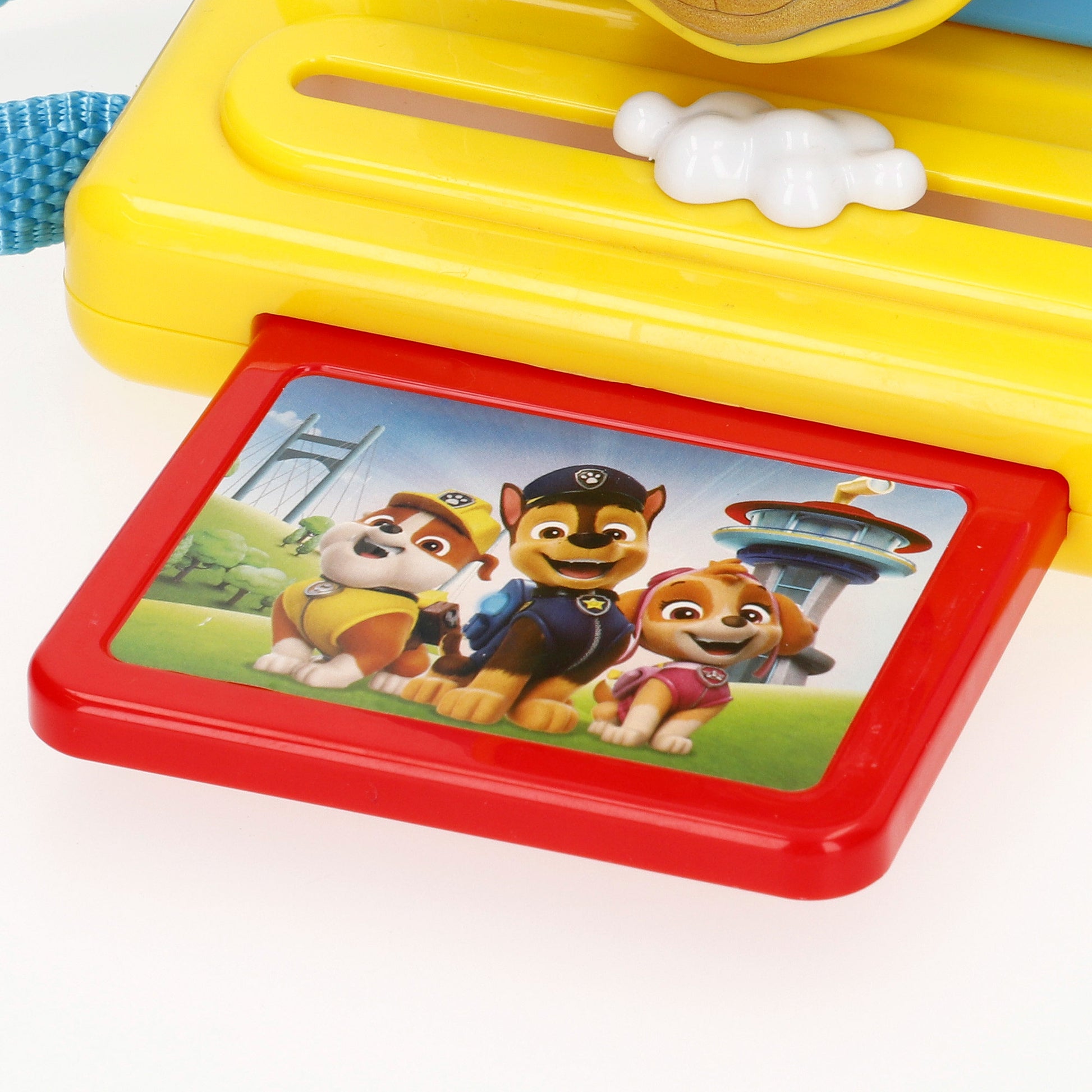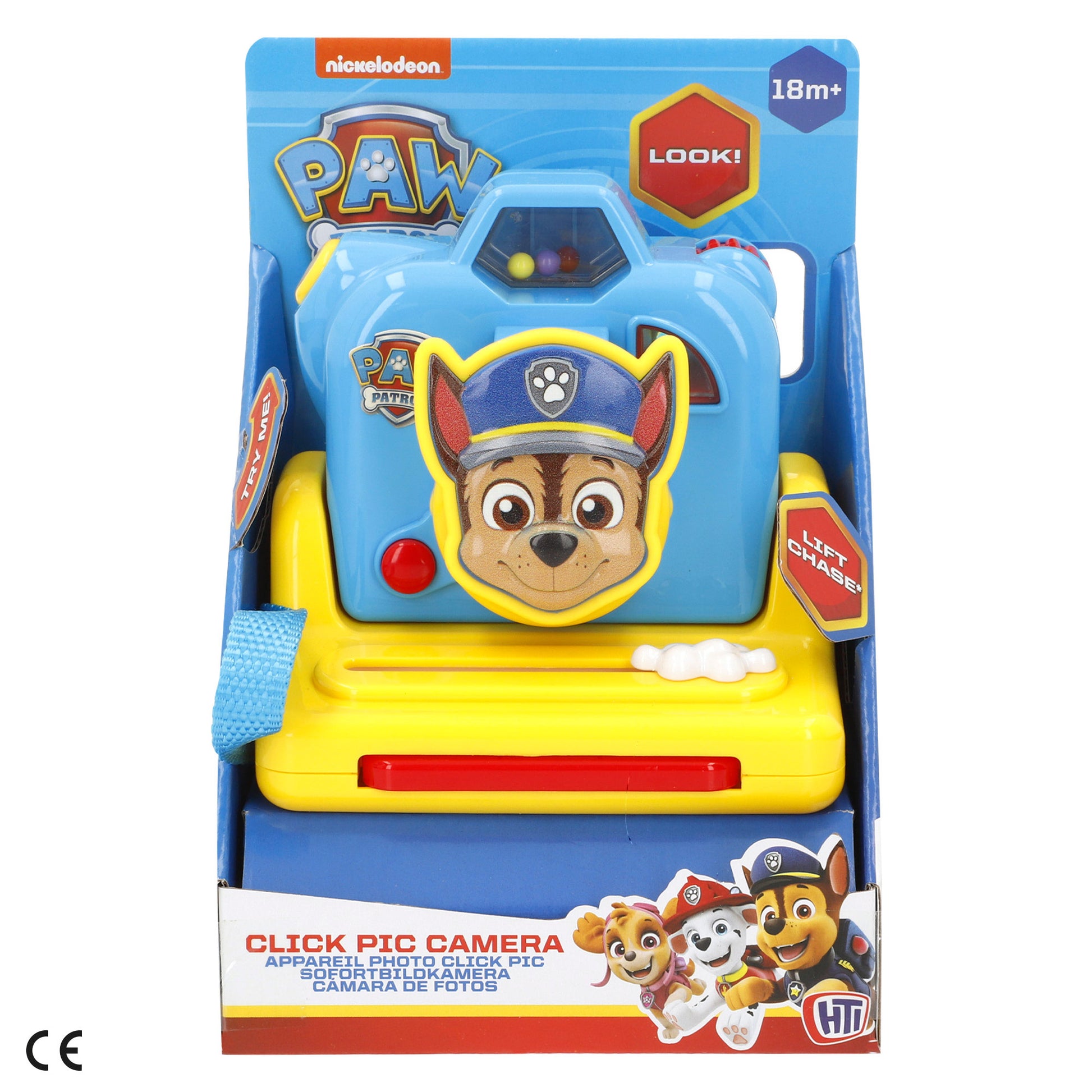 La cámara de fotos de La Patrulla Canina es un juguete interactivo 13x11x12,5 cm con licencia oficial, diseñado para niñas y niños a partir de los 18 meses. Al levantar la tapa frontal con forma de Chase, suena una melodía en inglés que despierta la atención del peque, y al presionar el botón principal aparece una imagen con Marshall, Chase y Sky.