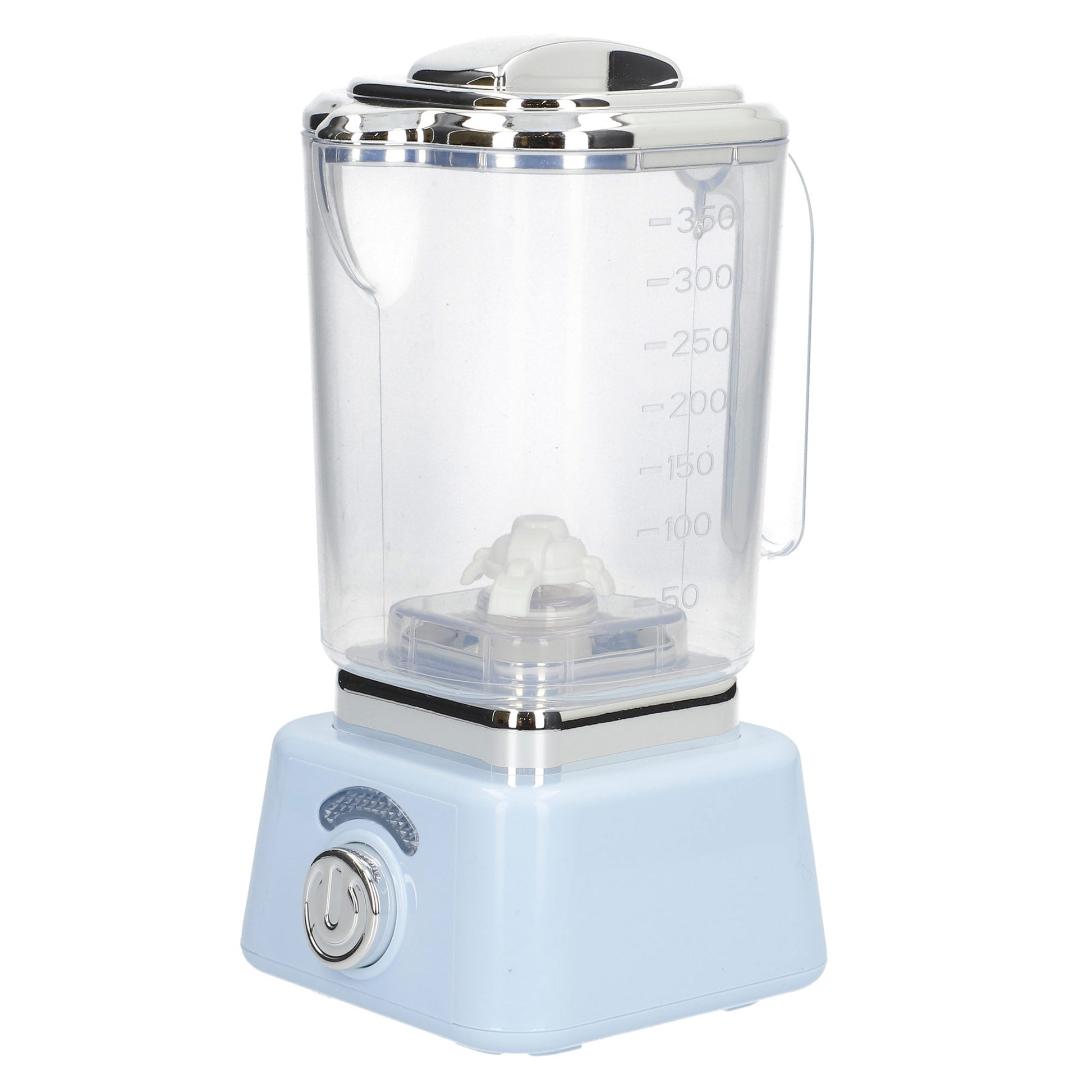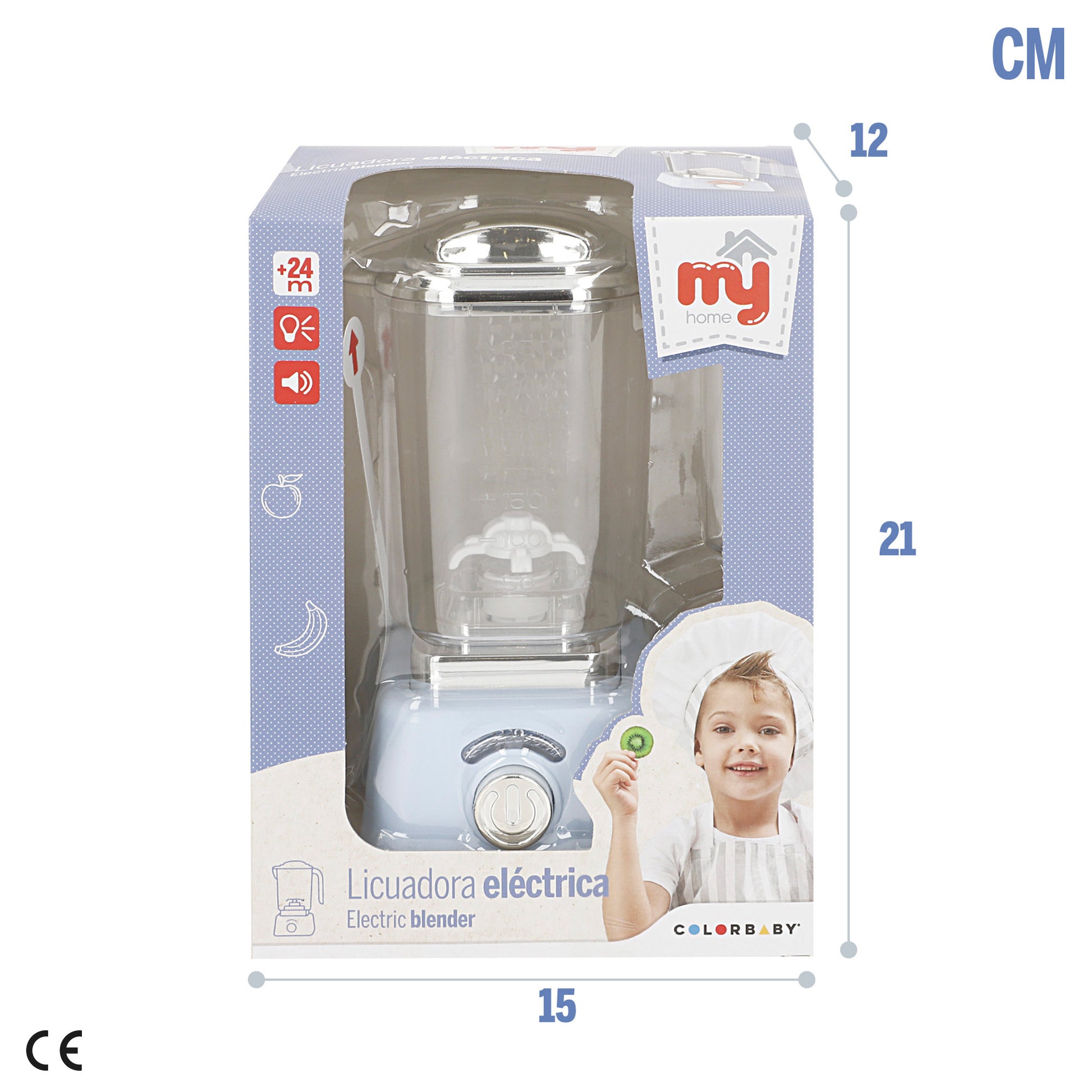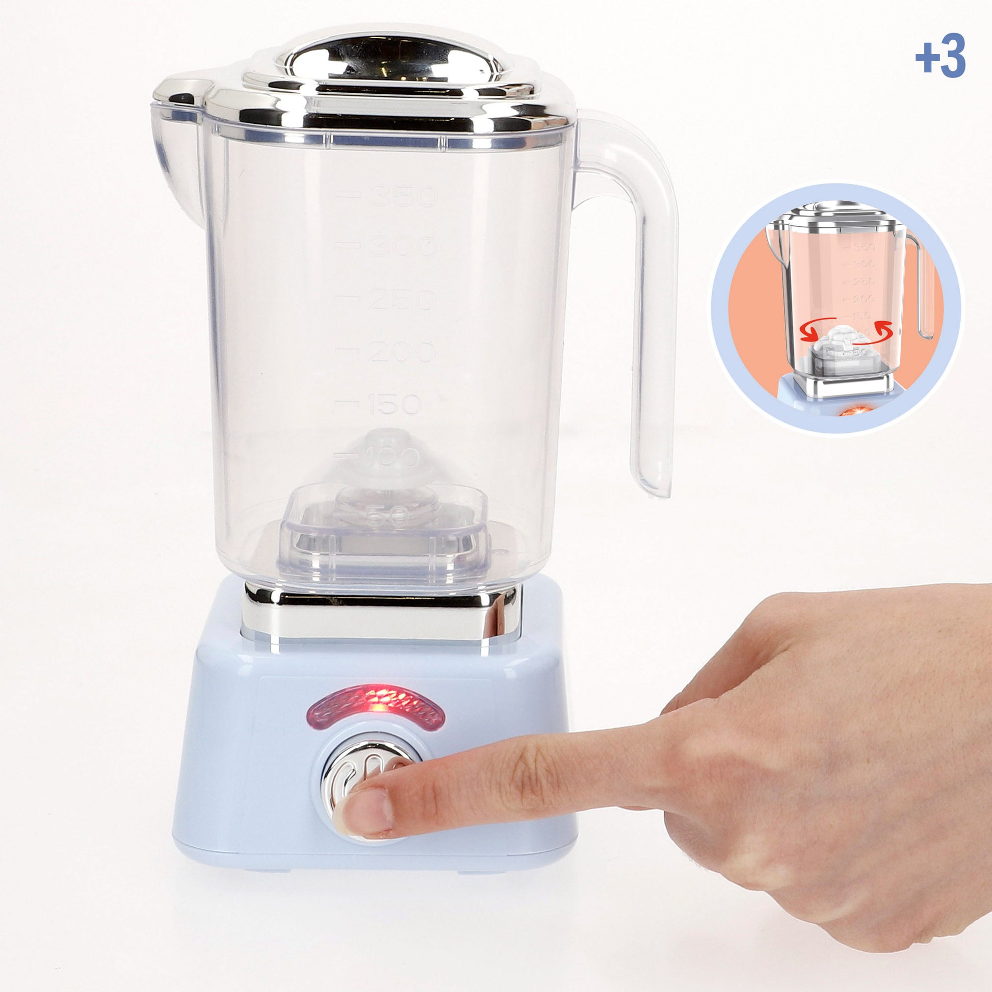 Esta licuadora de juguete está diseñada en color azul pastel con detalles en metálico brillante. El vaso medidor es extraíble y cuenta con un mango y una tapa que se puede poner o quitar manualmente para que los peques puedan preparar sus batidos imaginarios. Además, incorpora un botón que permite girar las astillas al mismo tiempo que activa las luces y el sonido para una experiencia más realista.