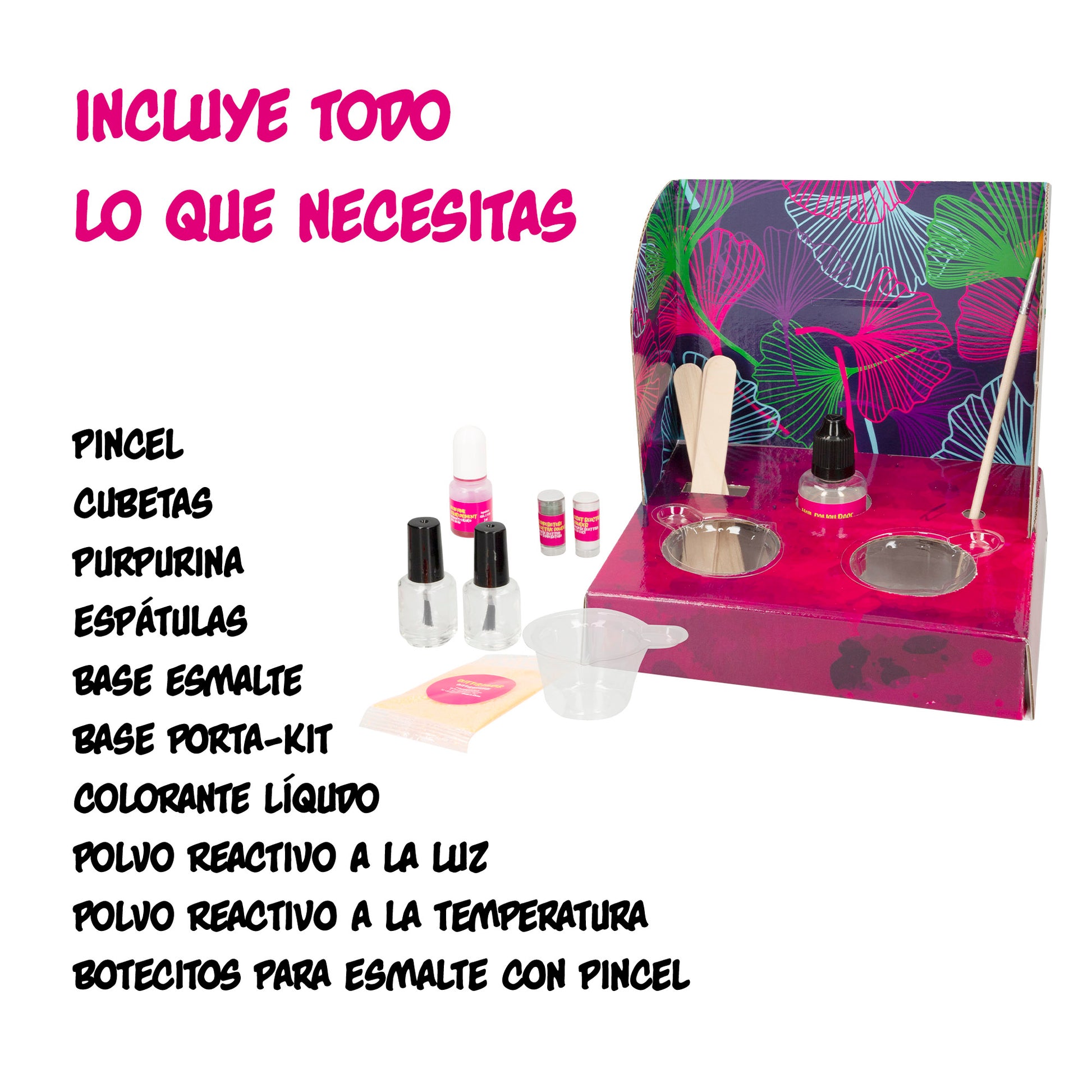 El kit para hacer pintauñas incluye 3 espátulas, 1 pincel, 3 recipientes, 1 base esmalte de uñas, 1 botecito de pigmento líquido rosa neón, 1 bolsita de purpurina en polvo y 2 botecitos de polvos, uno fotocromático que hará que tu pintauñas cambie de color con la luz del sol y otro termocromático que variará según la temperatura. ¡La elección es tuya! También incluye 2 botes de esmalte vacíos para llevarte tus creaciones donde quieras y 1 manual con instrucciones. Además, este kit incorpora un mini tocador para que puedas elaborar tus esmaltes de forma cómoda. ¡Es maravilloso!