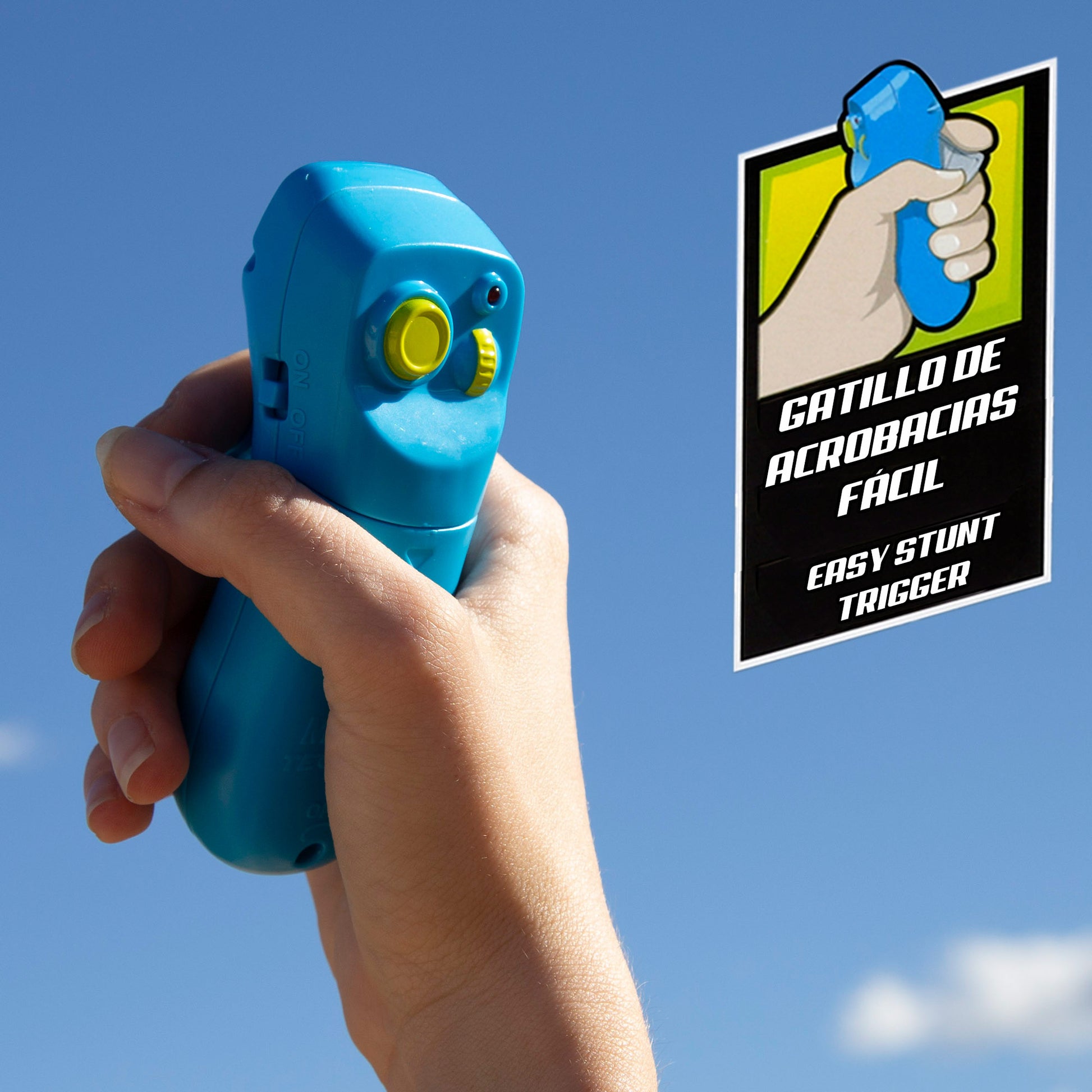 El Stunt Flyers viene con un mando radiocontrol ergonómico y fácil de usar, que opera a frecuencia 2.4 GHz. Incluye pegatinas para que puedas personalizar la avioneta tú mismo y una hélice de repuesto para asegurarte de que siempre esté lista para volar. ¡Una experiencia de vuelo de lo más divertida!