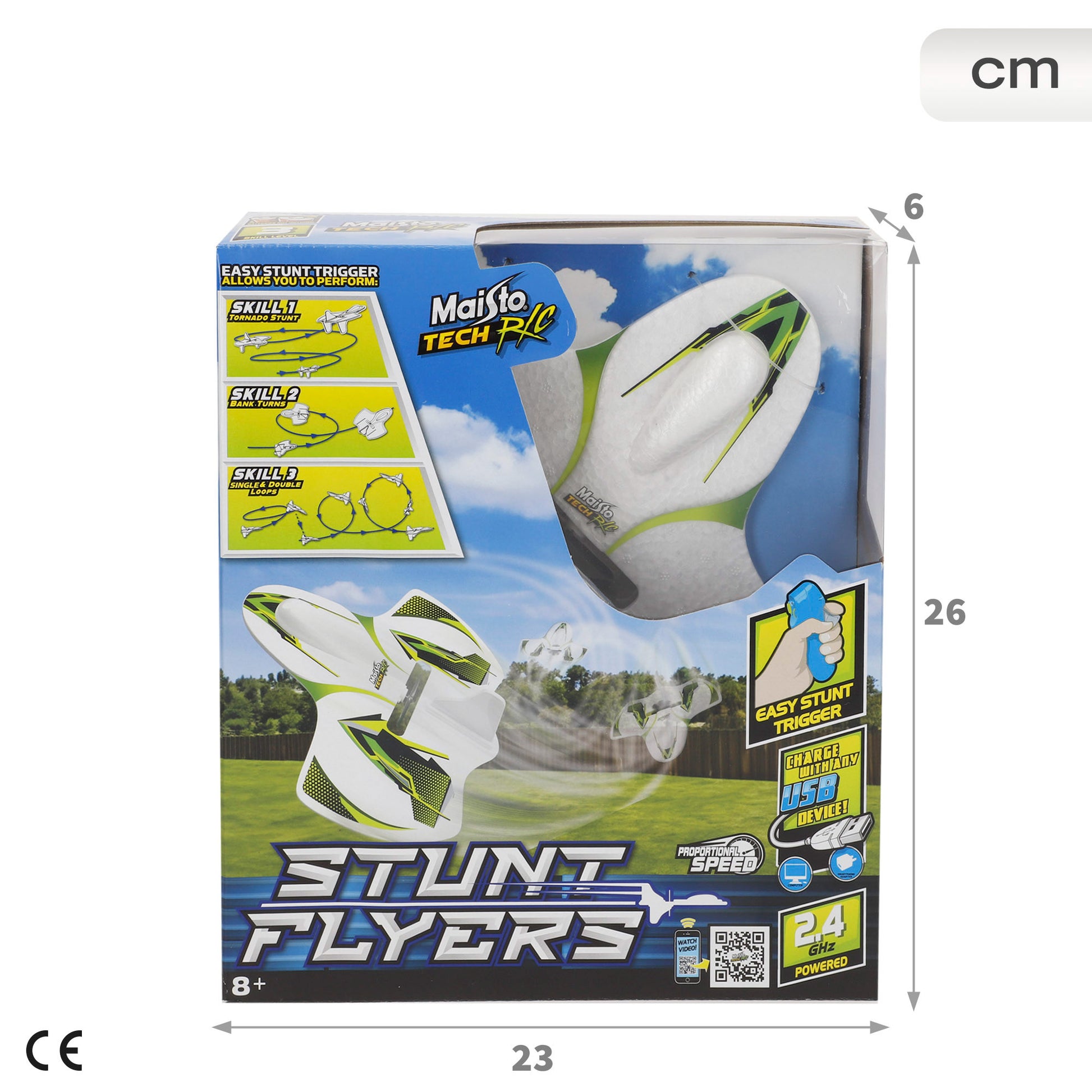 Recomendado para mayores de 8 años, el Stunt Flyers es una opción perfecta para quienes buscan emociones en el aire. Fabricada con espuma ligera y resistente, esta avioneta es segura y fácil de manejar tanto en interiores como exteriores, garantizando una experiencia de vuelo única y divertida. El mando funciona con 2 pilas AAA (no incluidas), mientras que la avioneta cuenta con una batería recargable con cable USB incluido. ¡Prepárate para disfrutar de acrobacias sin fin!
