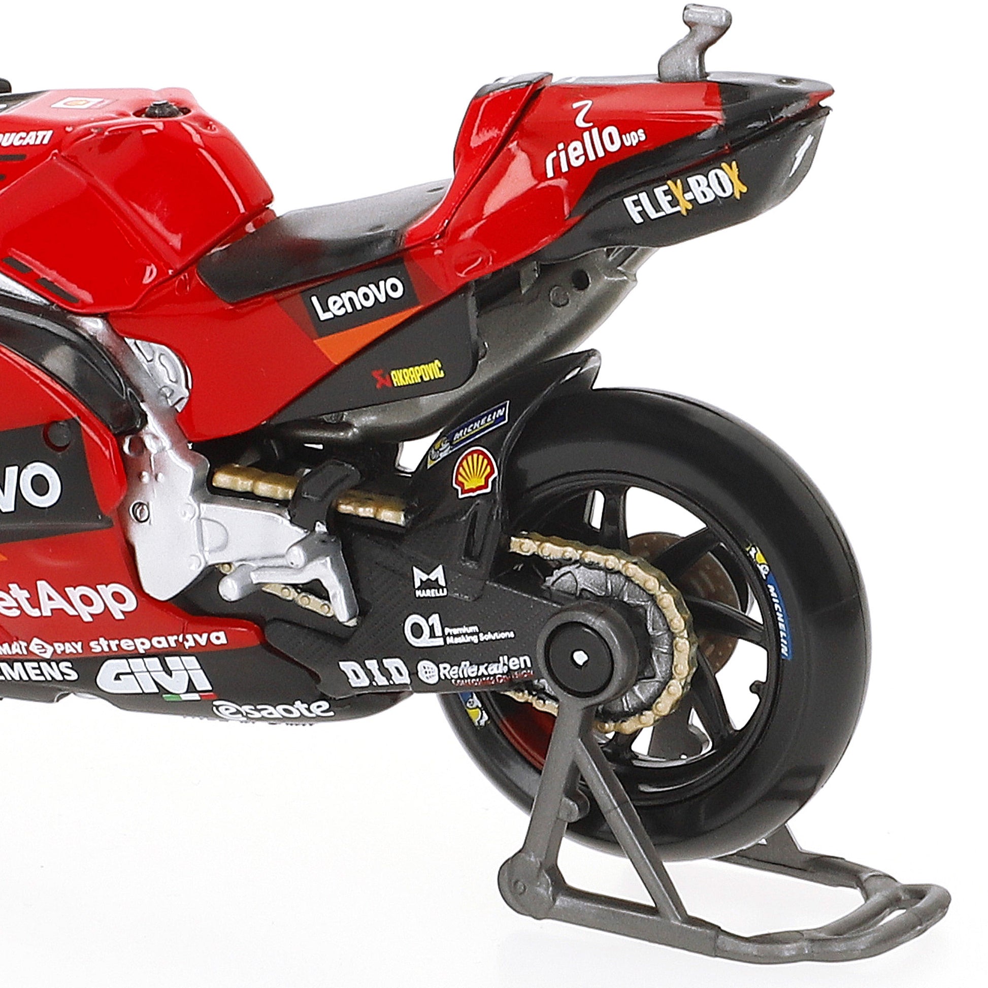 Esta réplica oficial de la Ducati Desmosedici GP 2023 viene cuidadosamente detallada para replicar el diseño exacto de la moto Ducati Lenovo. Incluye detalles como los logos de los patrocinadores, los gráficos oficiales del equipo, y una estructura aerodinámica precisa. Además, la moto de metal viene equipada con un soporte para mantenerla estable, lo que la hace perfecta para exhibir en estanterías o vitrinas.