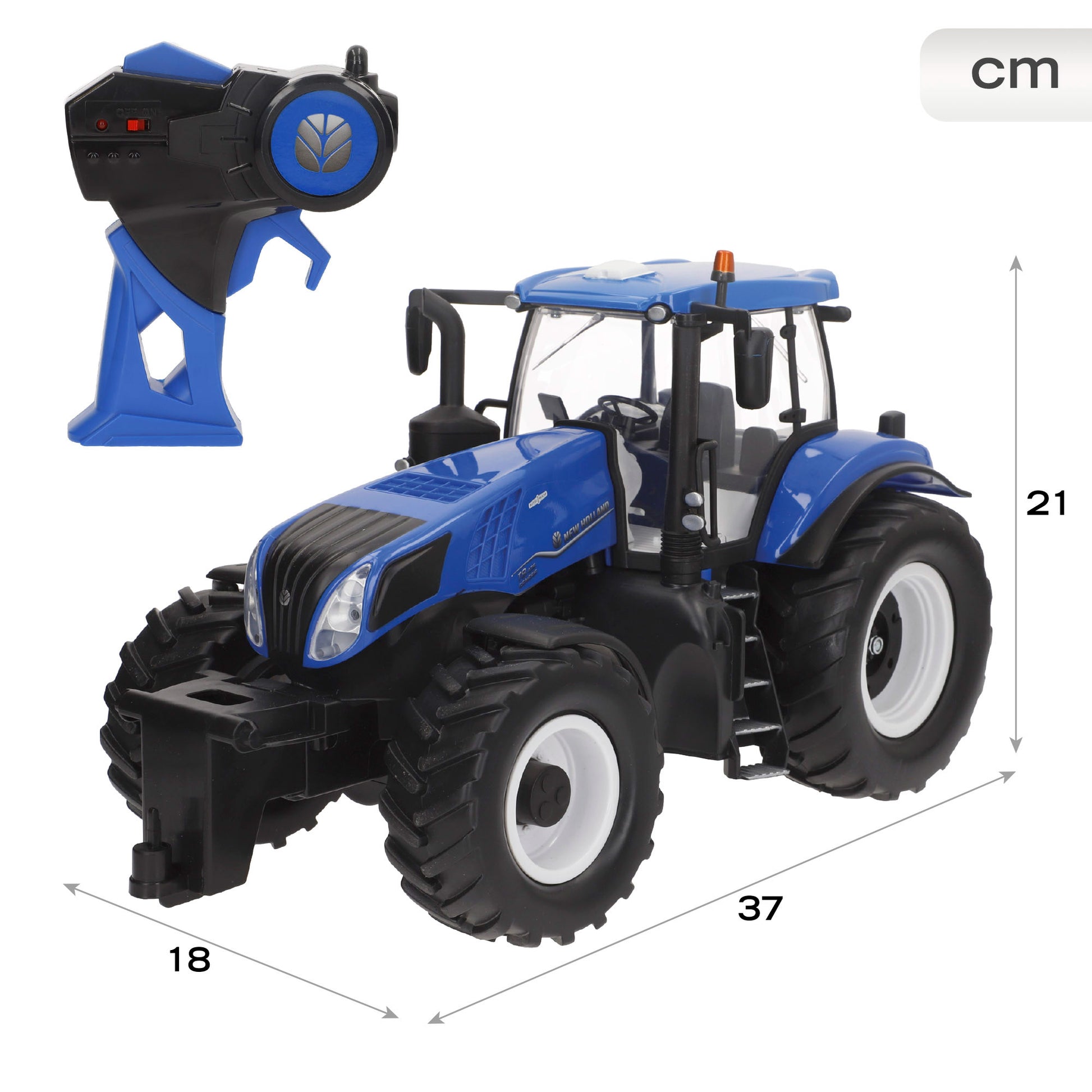 Recomendado para niños a partir de 8 años, el New Holland, con medidas de 37x18x21 cm, es un tractor radiocontrol robusto y preparado para cualquier terreno. El mando funciona con 2 pilas AAA (no incluidas) y el tractor con 4 pilas AA (no incluidas).