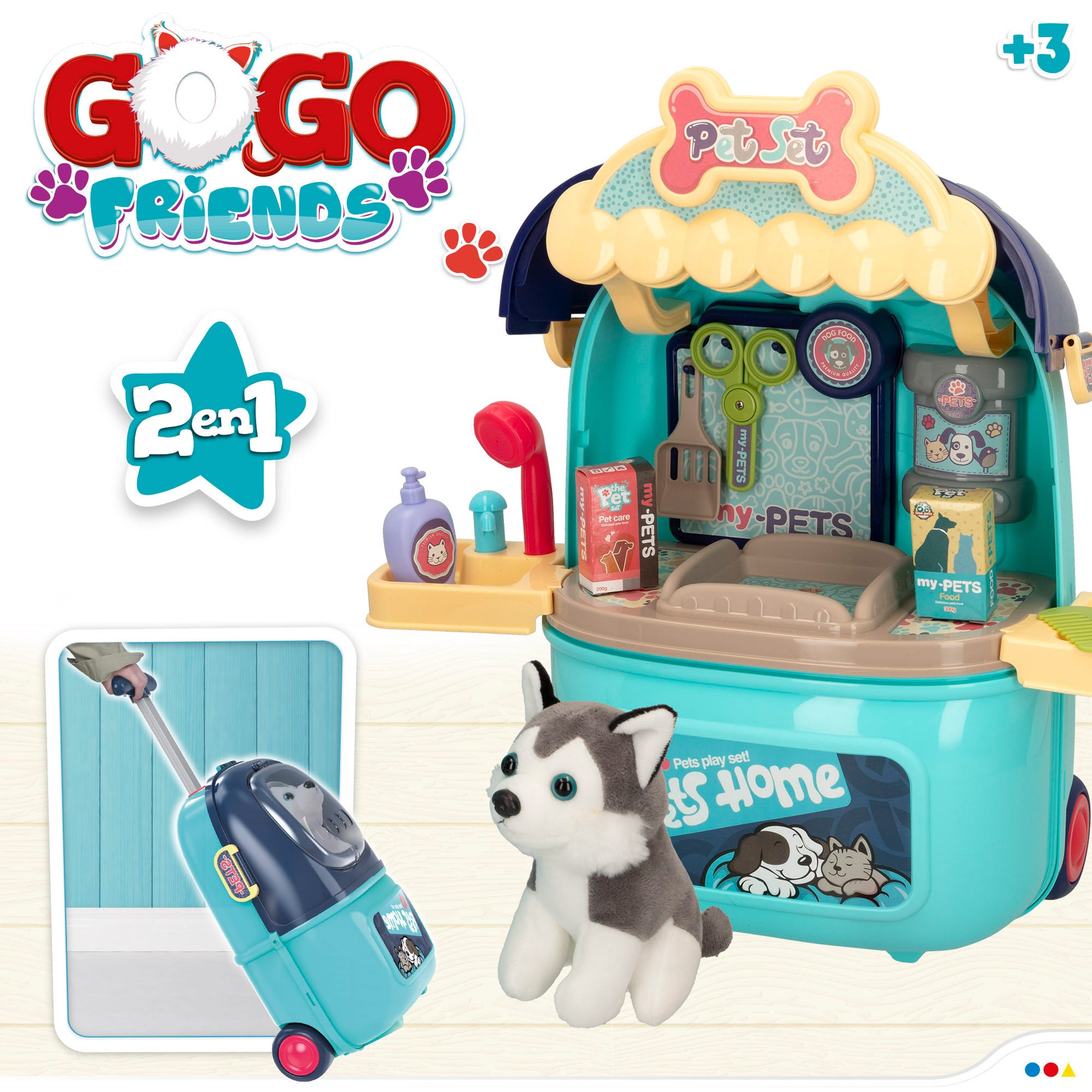 ¡Con este maletín peluquería canina juguete 2 en 1 Go Go Friends descubrirás tu vocación como peluquero canino! Cuida de las mascotas de tus clientes como si fueran tuyas gracias a todos los accesorios que incluye y conviértete en el peluquero más famoso y adorable de la ciudad. Podrás lavarlos, cortarles el pelo, jugar con ellos, darles de comer y dejarlos descansar un ratito hasta que se relajen y duerman tras la sesión de belleza. ¡No te olvies de darles un premio por haberse portado tan bien! Cuando termines con tu labor, guarda todos los accesorios en el maletín con asa y ruedas y transpórtalo con facilidad hasta la próxima vivienda.