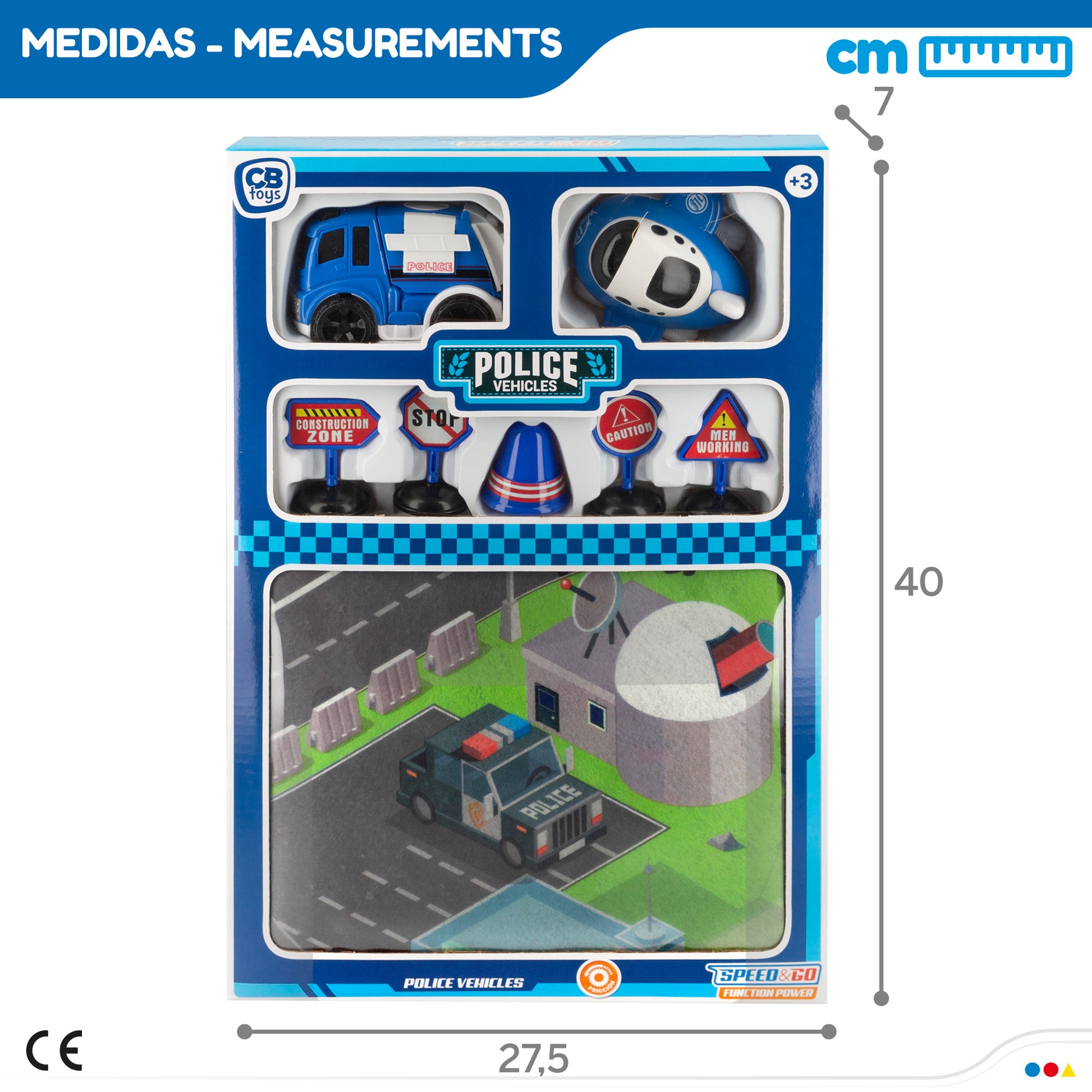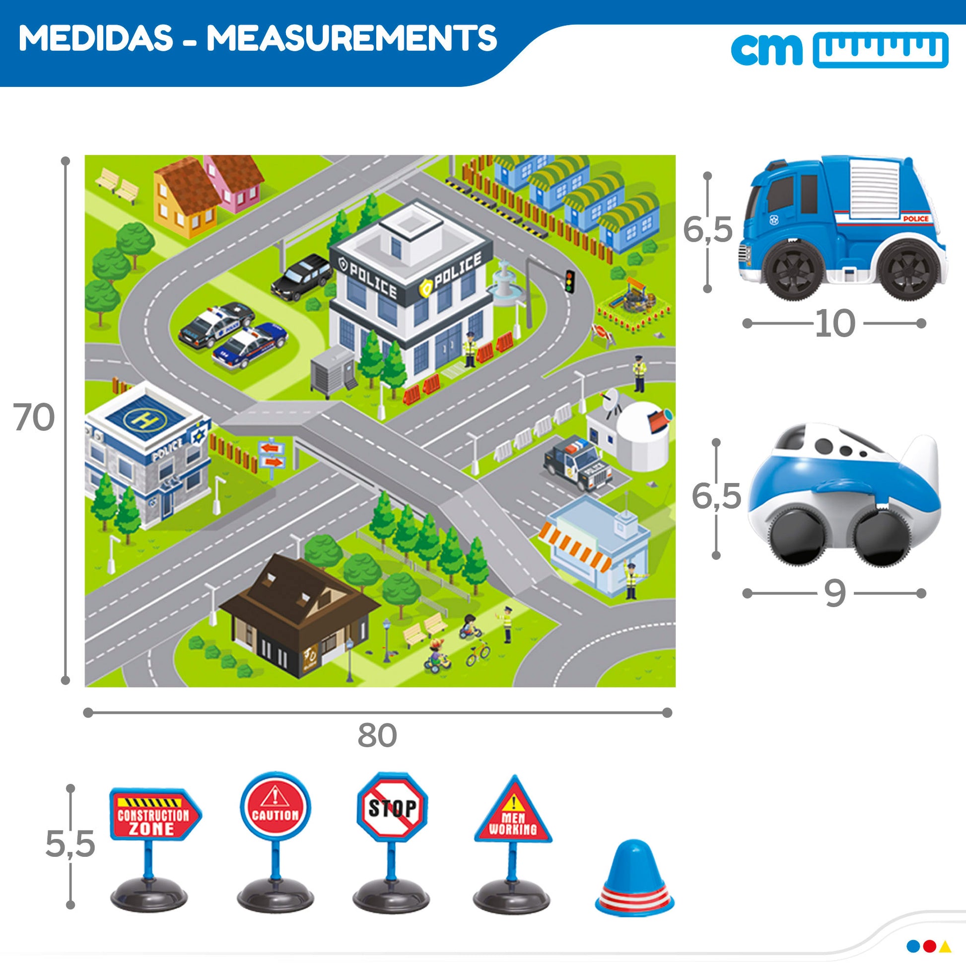 Juega y pásalo en grande patrullando la ciudad con el coche y el avión de policía en la alfombra de actividades Speed & Go. La alfombra tiene un tacto suave y mide 80x70 cm. Incluye 2 vehículos con sistema de fricción y señales de tráfico. Se recomienda para niños a partir de 3 años. Los niños desarrollan la imaginación.
