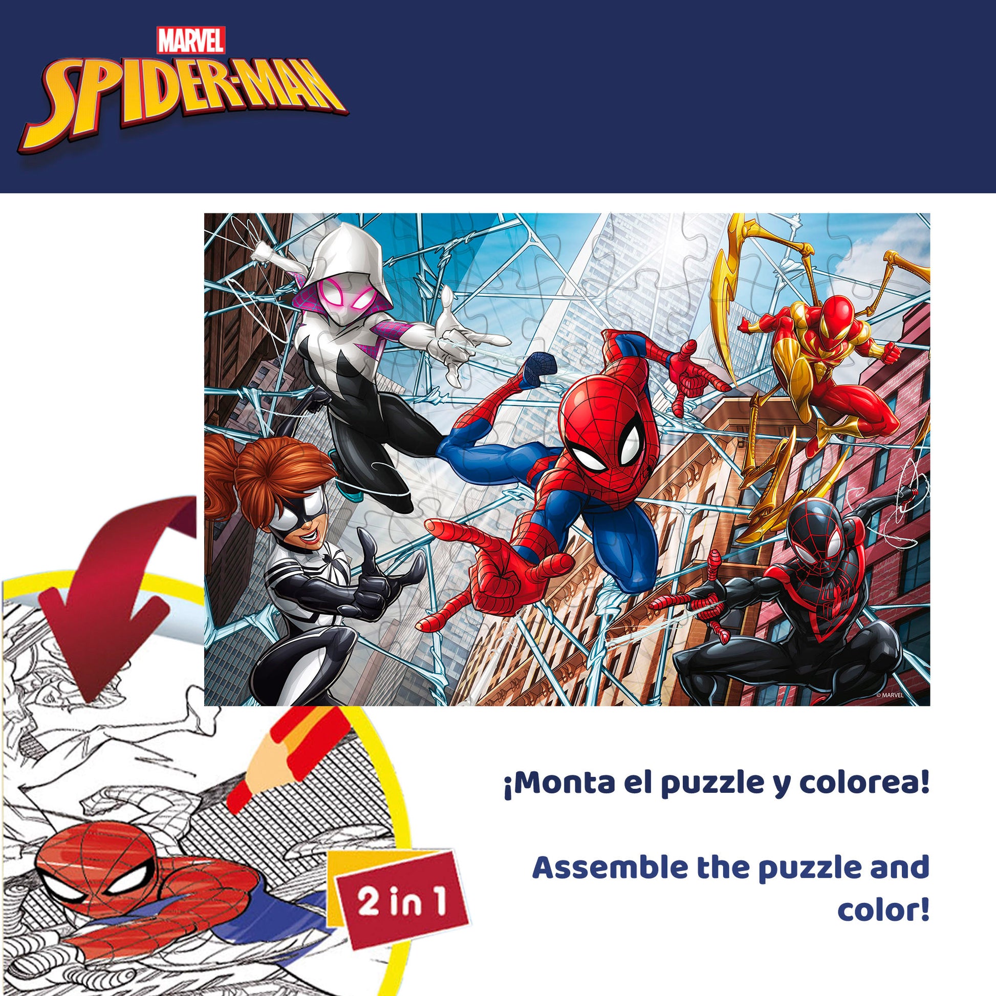 Cada puzzle Spider-Man cuenta con 60 piezas con doble cara (una ya coloreada y otra en blanco y negro para colorear libremente).