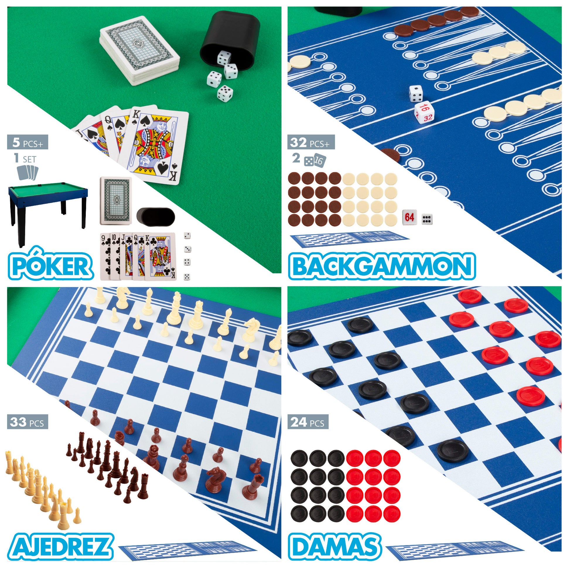 Esta mesa incorpora 12 juegos para divertirte en familia ¡y sin salir de casa! Va equipada con un billar y una segunda superficie con futbolín, pista de ping-pong, pista de air hockey y tablero para jugar al ajedrez, las damas, el backgammon, los bolos, el tejo, el póker, la herradura y el lanzamiento de aros. ¡Los juegos te darán para una tarde entera de diversión! Incluye más de 150 piezas con todos los accesorios de cada juego.
