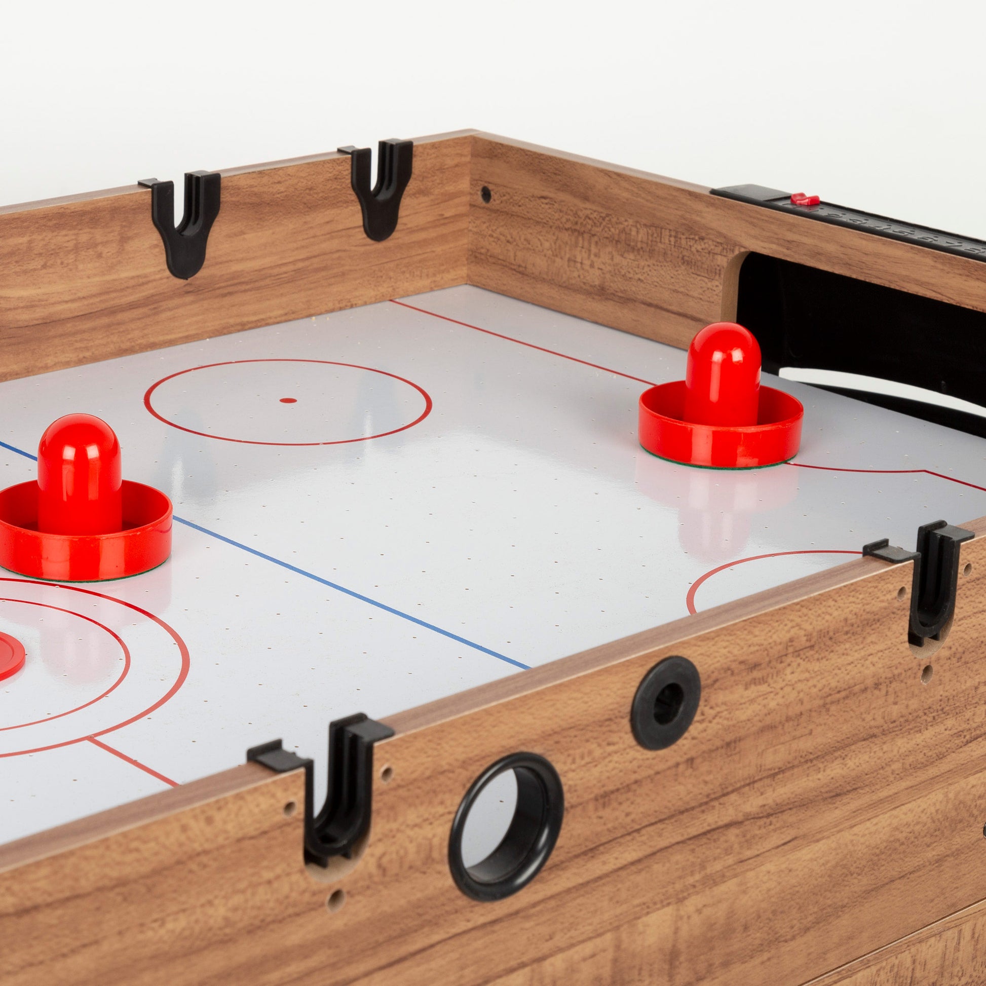 Esta mesa multijuegos 3 en 1 de CB Games viene con todos los accesorios necesarios para disfrutar al máximo de cada modalidad. Para el futbolín cuenta con dos pelotas y barras de acero con figuras de jugadores rojas y amarillas para partidos emocionantes. En la modalidad de billar incluye 16 bolas, 2 tacos, un triángulo de colocación y una tiza para partidas como un profesional. El juego de hockey de aire viene equipado con dos paletas y un disco para partidas dinámicas y rápidas. Además, la mesa incorpora dos marcadores manuales para llevar el control de los puntos tanto en futbolín como en hockey de aire. Para mayor comodidad, cuenta con soportes donde puedes guardar las figuras del futbolín cuando cambias al modo de hockey, manteniendo todos los accesorios organizados y listos para el siguiente juego.