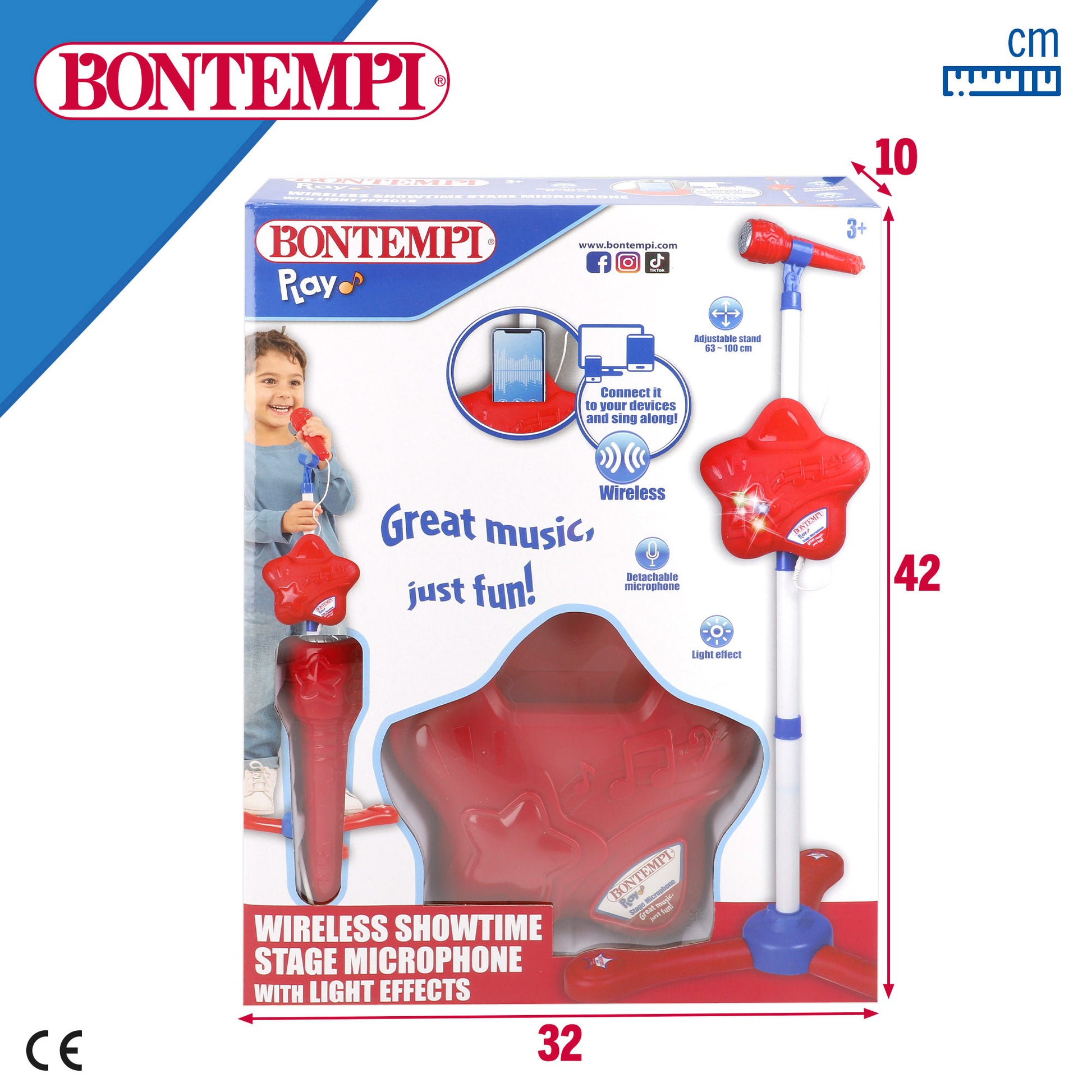 El set está compuesto por un micrófono con cable, soporte ajustable en altura, base de tres patas para mayor estabilidad y un módulo en forma de estrella con efectos de luz. También cuenta con entrada auxiliar para conectar dispositivos y reproducir música.