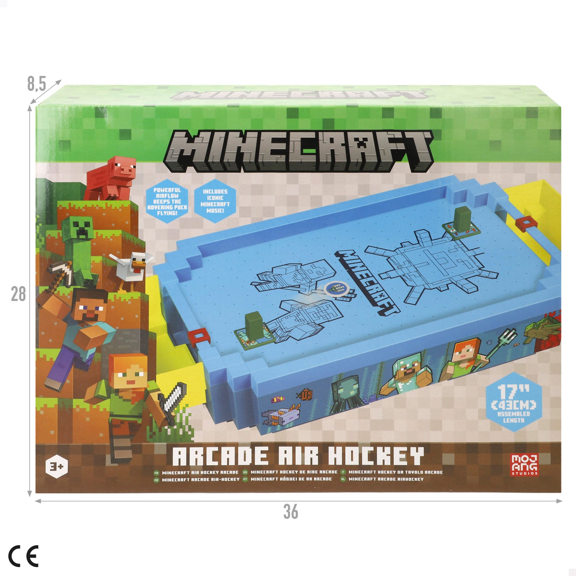 Es una mesa arcade air hockey con licencia oficial Minecraft que funciona con flujo de aire eléctrico para hacer flotar el disco; su campo azul está inspirado en el Underwater el bioma submarino y ofrece partidas rápidas y divertidas en formato de sobremesa.