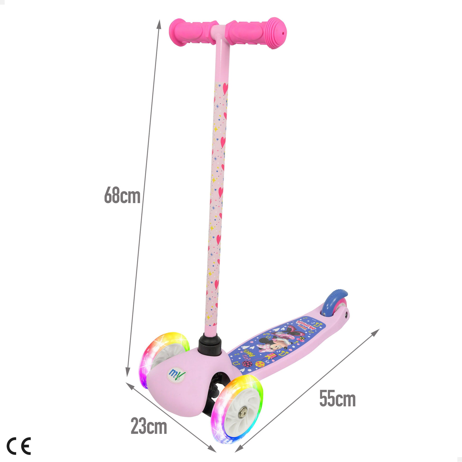 ¡Empieza a rodar con Minnie y recorre tu barrio con colorido patinete de tres ruedas 55x23x68 cm ! Su diseño infantil, decorado con nuestra ratona más querida Minnie Mouse y sus divertidas ruedas con luces harán que los peques se diviertan con sus dibujos favoritos. Ideal para quienes dan sus primeros pasos sobre ruedas, con total seguridad, estabilidad y mucho estilo.