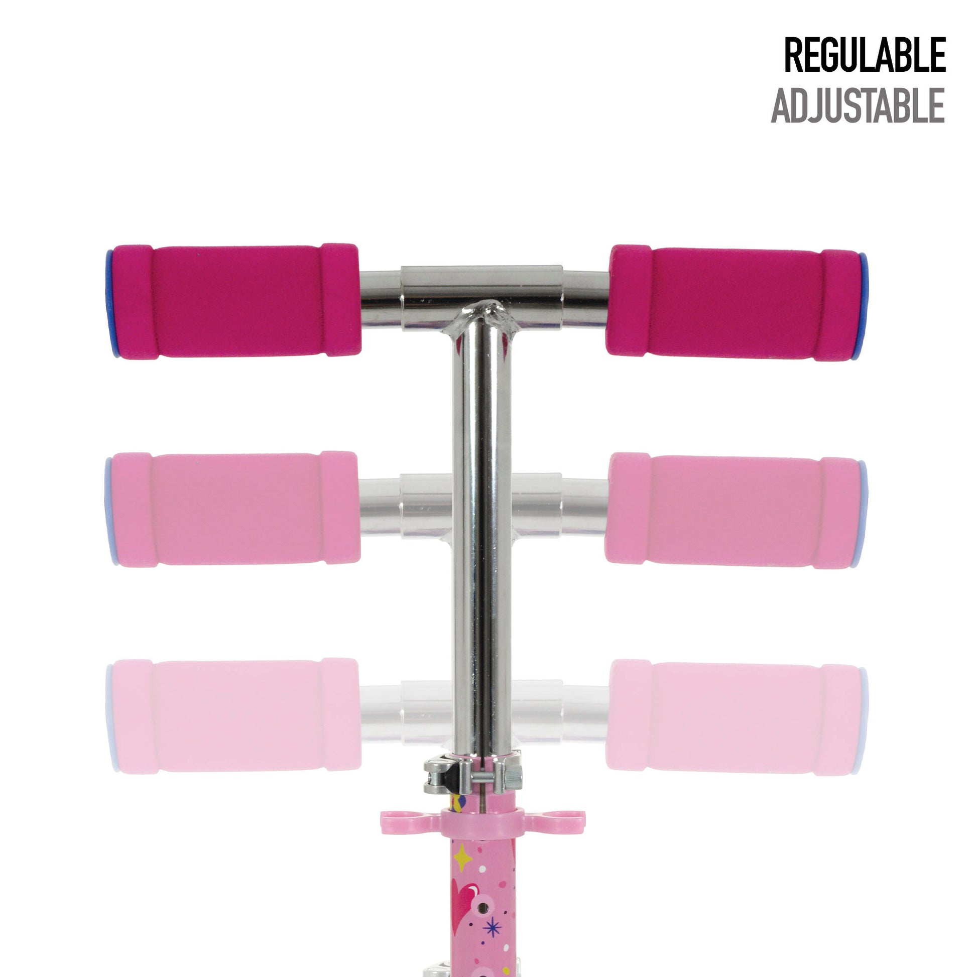 Este patinete cuenta con puños cómodos, base antideslizante para mayor seguridad y un manillar ajustable en altura (ideal para adaptarse al crecimiento del niño). Gracias a su sistema de plegado rápido con palanca, se guarda y transporta fácilmente.