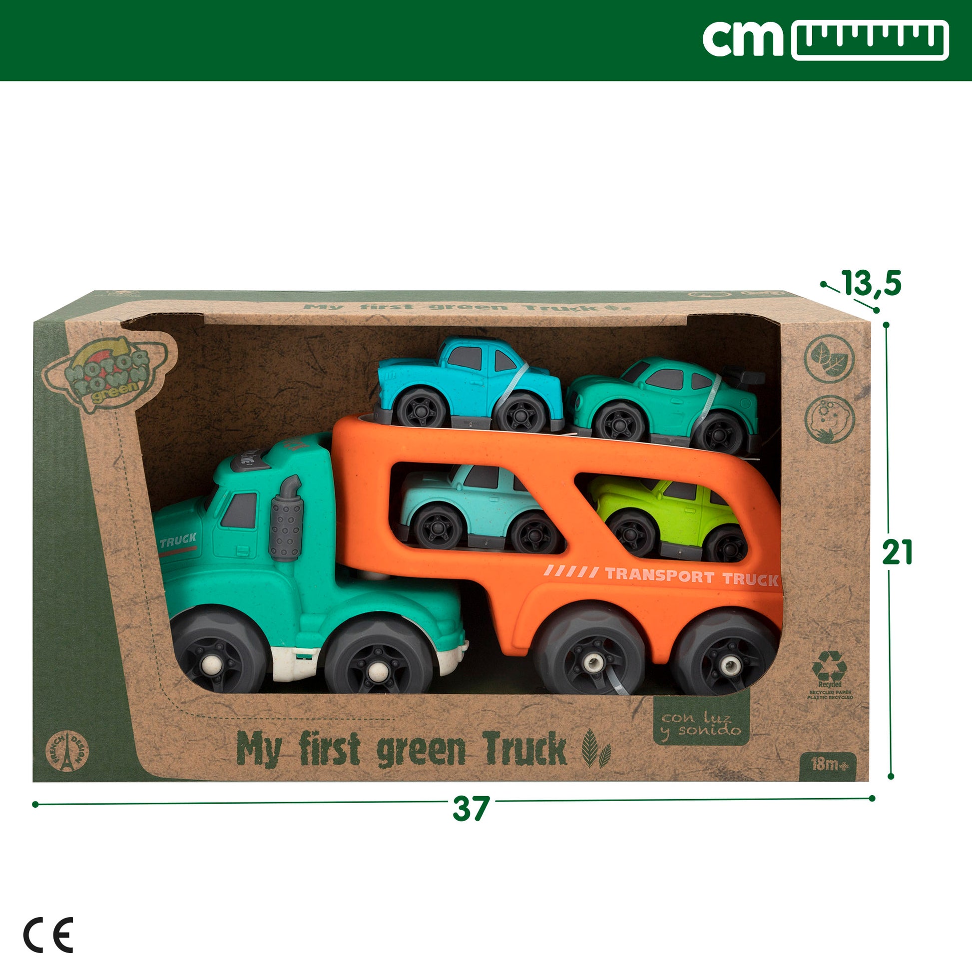 Este set de camión de juguete está recomendado a partir de 18 meses. El camión funciona con 3 pilas AG13 (incluidas) y tanto los vehículos que incluye el set como el packaging del producto están fabricados con materiales reciclados. Está disponible en dos modelos surtidos que se enviarán aleatoriamente dependiendo de su disponibilidad.