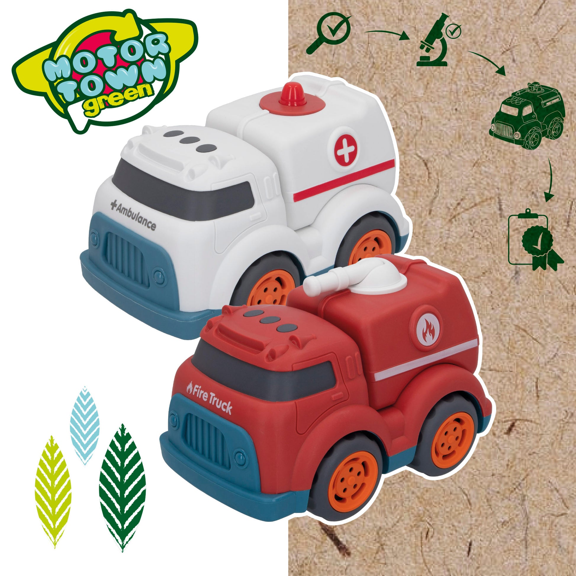 ¡Preparados para atender cualquier emergencia con este set de vehículos Motor Town Green! El set incluye un camión de bomberos y una ambulancia interactivos fabricados con materiales reciclados: la puerta trasera del camión de bomberos se puede abrir y cerrar manualmente y la manguera se puede mover hacia arriba y hacia abajo para “sofocar el fuego”; la puerta trasera de la ambulancia se puede abrir y cerrar manualmente para “sacar a los pacientes”. Al estar fabricado con materiales reciclados, con este set aprenderán sobre valores sostenibles, mientras juegan a imaginar que son bomberos o conductores de ambulancia por un día.