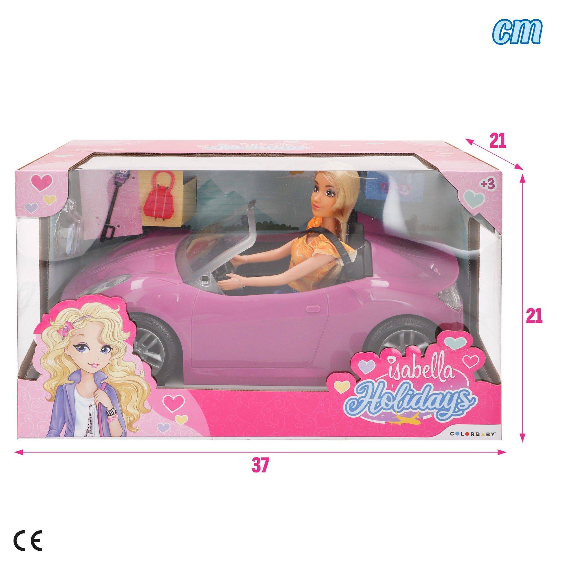 Recomendado para niños a partir de 3 años. La muñeca Isabella mide 8x27 cm y el coche descapotable de juguete tiene unas medidas de 33x18x13 cm.