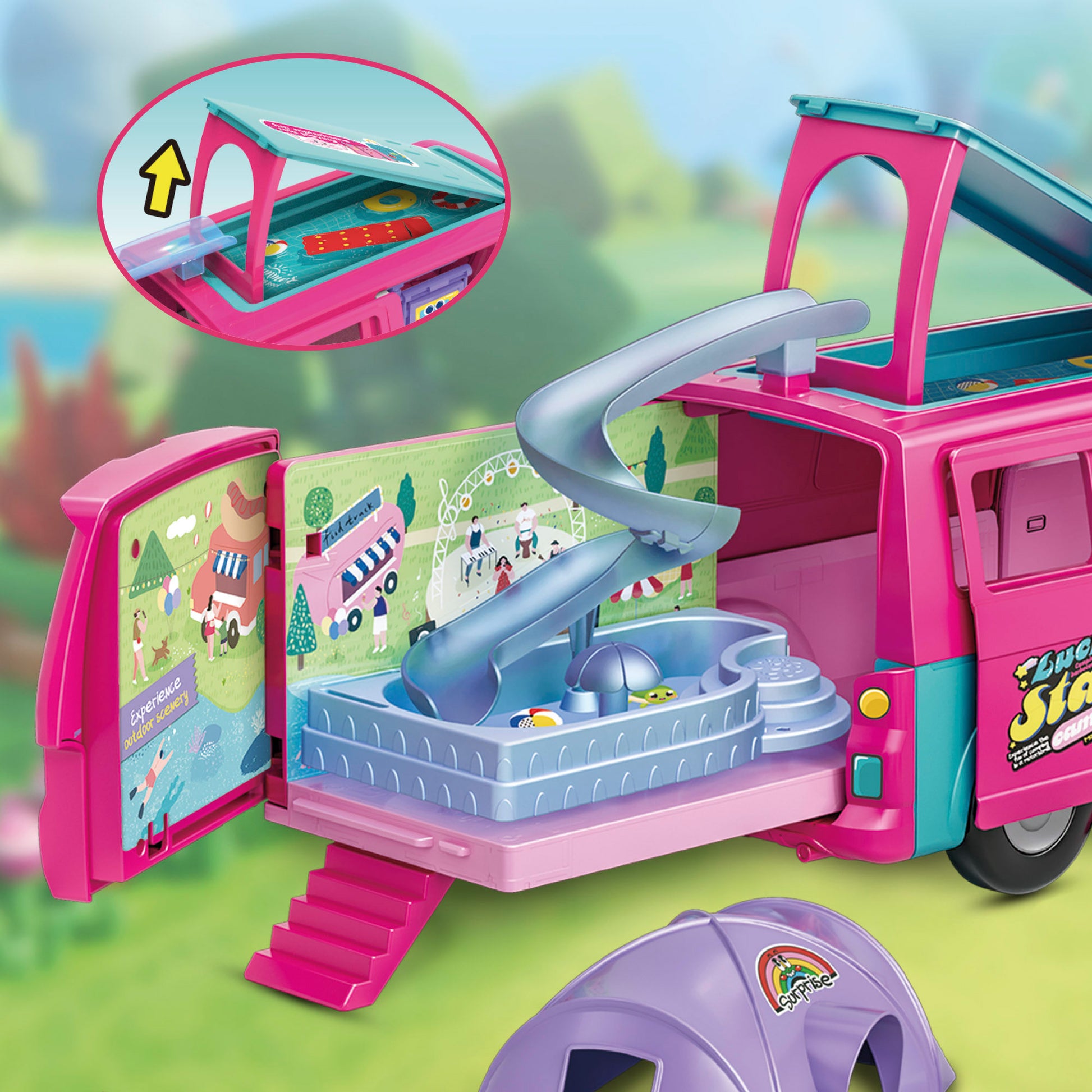 Este juguete no solo es una fuente inagotable de entretenimiento, sino que también fomenta la imaginación al permitirles a los pequeños crear sus propias historias a través del juego simbólico. La interacción con los diferentes accesorios y funciones de la furgoneta promueve la motricidad, especialmente cuando mueven la furgoneta por el suelo simulando viajes o usan las pequeñas piezas para organizar el campamento. Además, al crear historias y situaciones de juego, los niños fortalecen sus emociones, ya que el juego de roles les ayuda a expresar y comprender sus propias emociones y las de los demás.