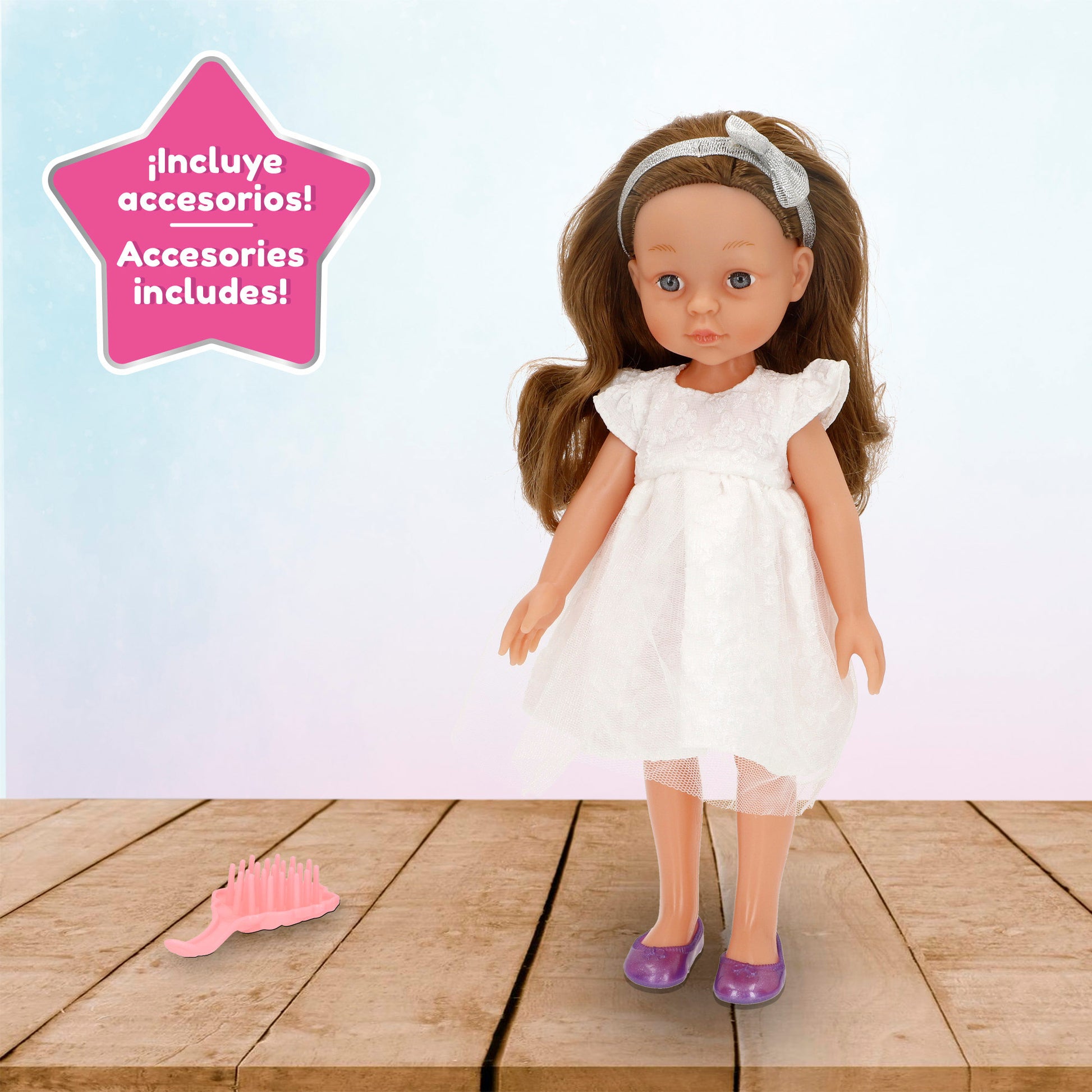 La muñeca bebé mide 32 cm, tiene el cuerpo duro y es articulada en brazos y piernas. Viene vestida con un hermoso vestido blanco y una diadema de lazo a juego. Además, incluye accesorios como un cepillo para peinar su larga y hermosa melena castaña.