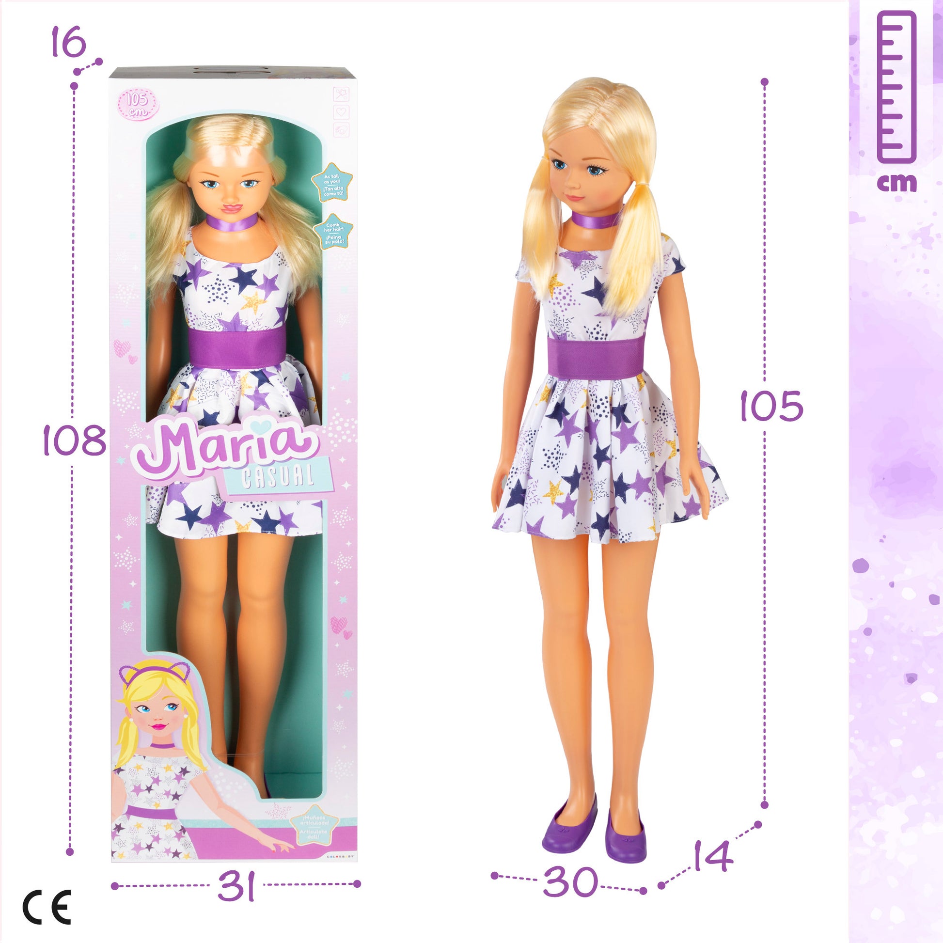 Diviértete jugando con tu mejor amiga, ¡la muñeca María! Cepilla y peina su larga melena rubia o cambia su look para salir de paseo junt@s. La muñeca mide 105 cm, sus brazos y piernas son articulados y puede mantenerse de pie o sentada. María lleva un vestido, una cinta en el cuello y también zapatos. Es un juguete recomendado a partir de 3 años. Desarrolla la imaginación, la afectividad y la motricidad fina.