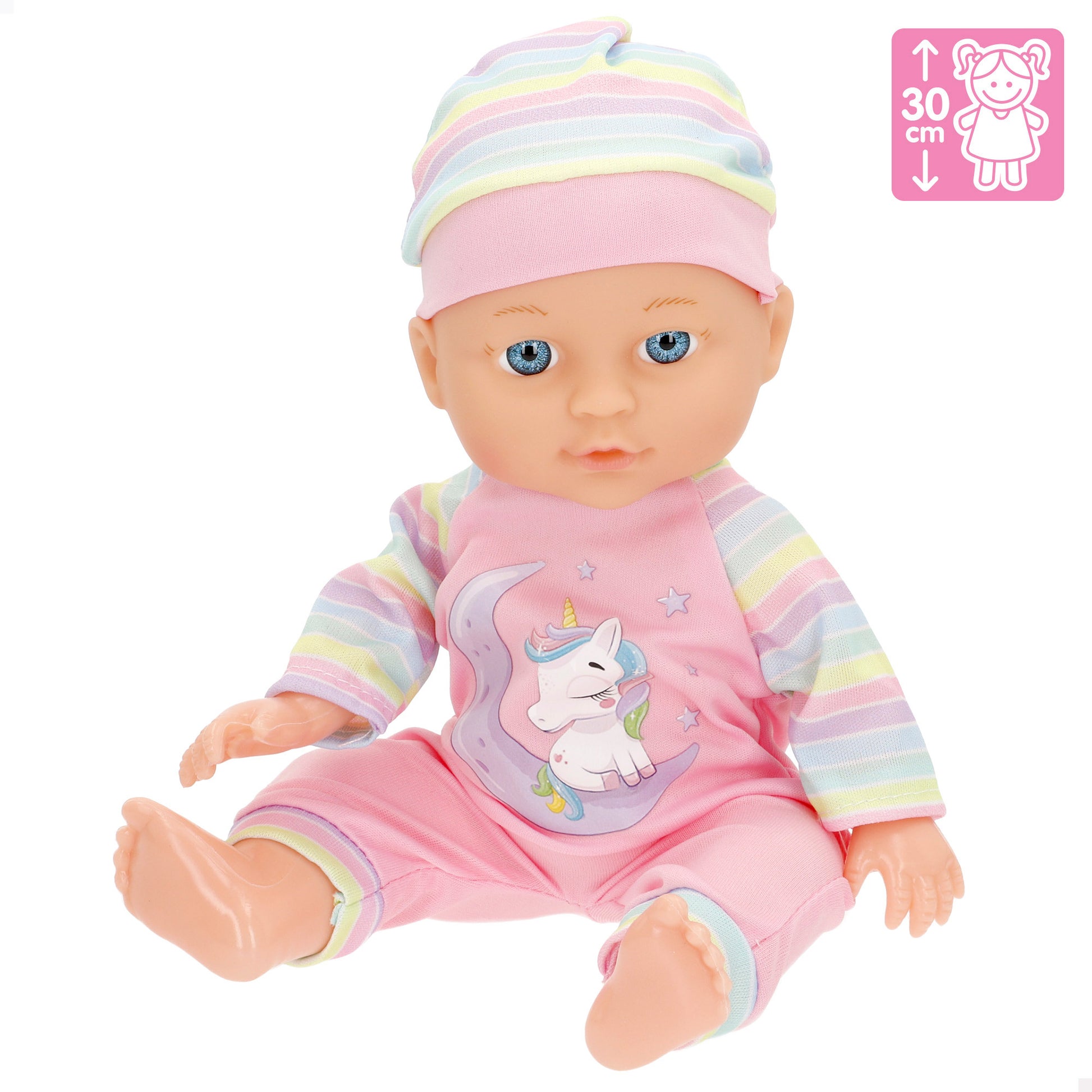 El set contiene un muñeco bebé de 30 cm con cuerpo rígido, vestido con un pijama de rayas y gorrito a juego, un balancín con forma de unicornio rosa y un biberón. Además, incluye un divertido sonajero con varias llaves de colores para añadir más juego y entretenimiento.