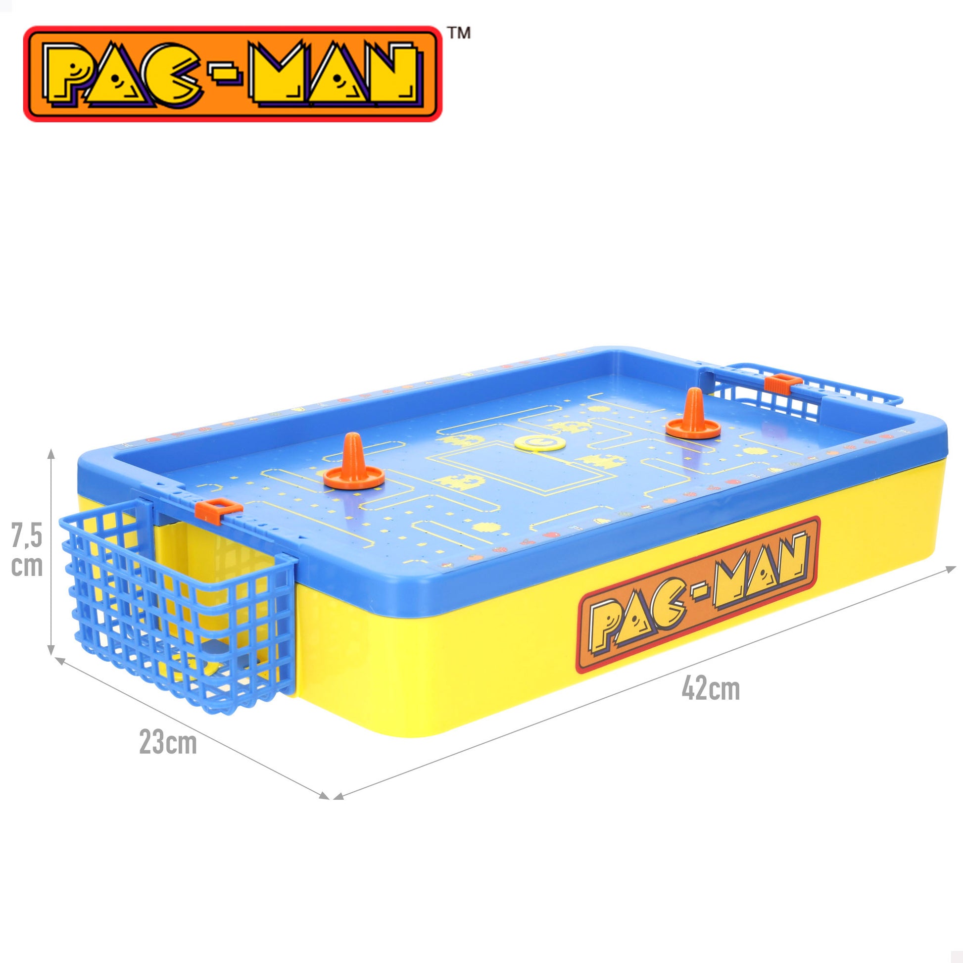 Trae el tablero de 42x23x8 cm, dos palas naranjas, dos discos amarillos, porterías tipo canasta azules y contadores manuales deslizantes, todo decorado con Pac-Man, fantasmas y frutas.
