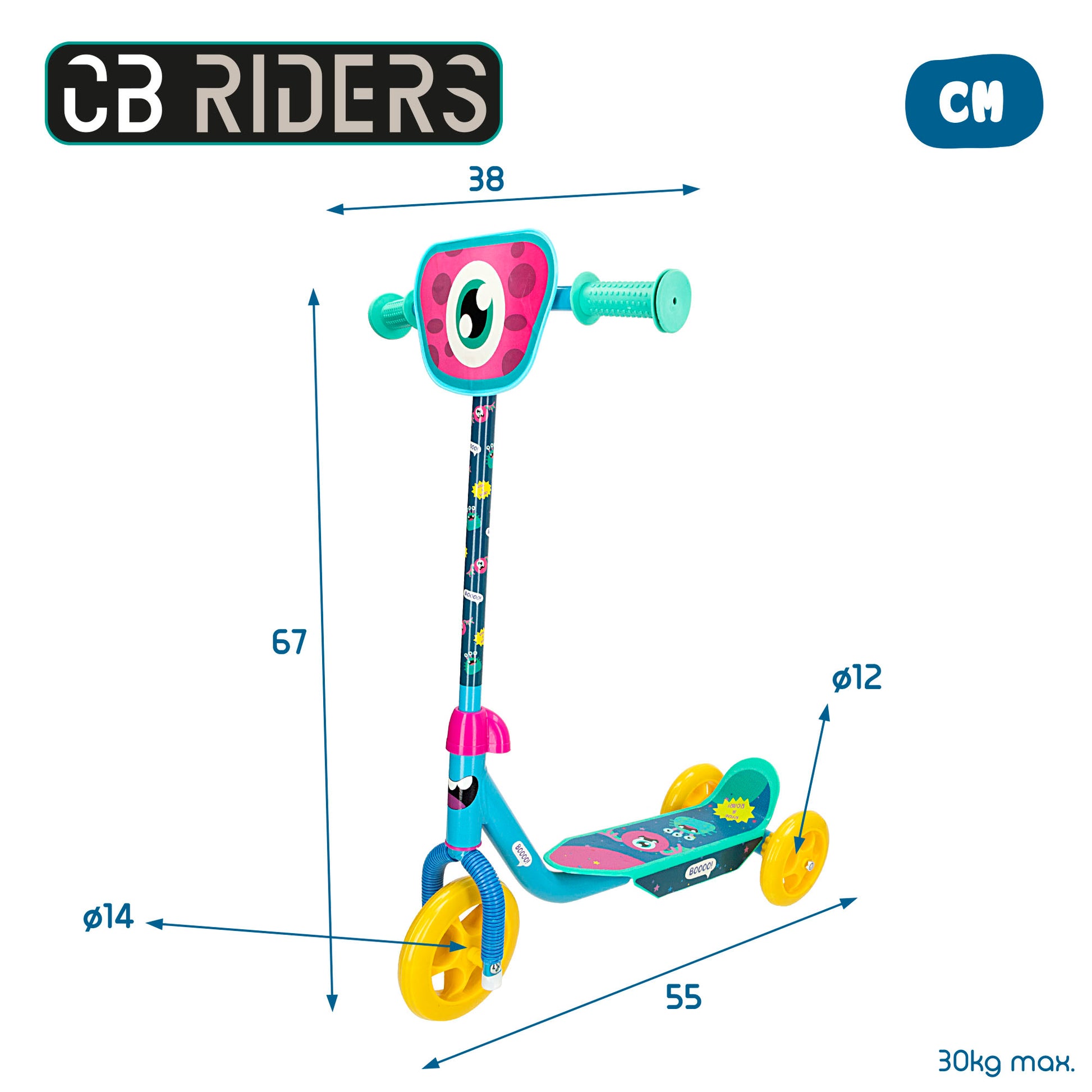 ¡Recorre todo el vecindario con el colorido monopatín de 3 ruedas CB Riders! Con su diseño llamativo y su divertida placa frontal con la ilustración de un ojo monstruoso, sorprenderás a todo aquel que pase por tu lado. ¡Todos querrán tener tu fantástico patinete!