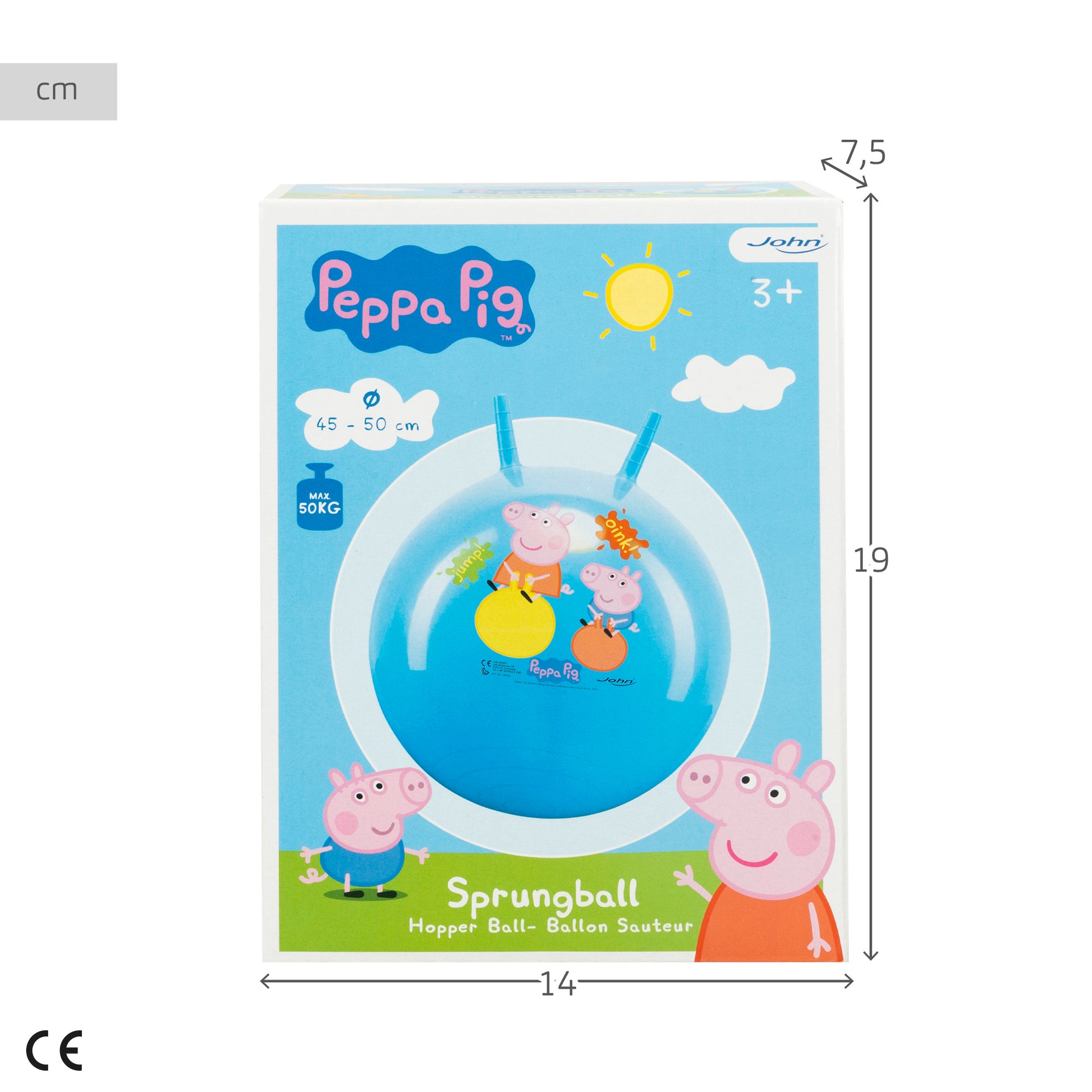¡Salta y rebota una y otra vez sobre la pelota saltarina de Peppa Pig! La pelota es color azul con una ilustración en el centro de la protagonista de la serie que da nombre a sus dibujos y de su hermano George Pig felices sobre dos pelotas saltarinas. Incorpora dos agarres ergonómicos en la parte superior para mayor seguridad durante cada salto, está fabricada de PVC, se recomienda hinchar de 45-50 cm de diámetro y soporta hasta 50 kg. ¡Los niños se lo pasarán en grande mientras mejoran su equilibrio y realizan ejercicio físico sin apenas darse cuenta!