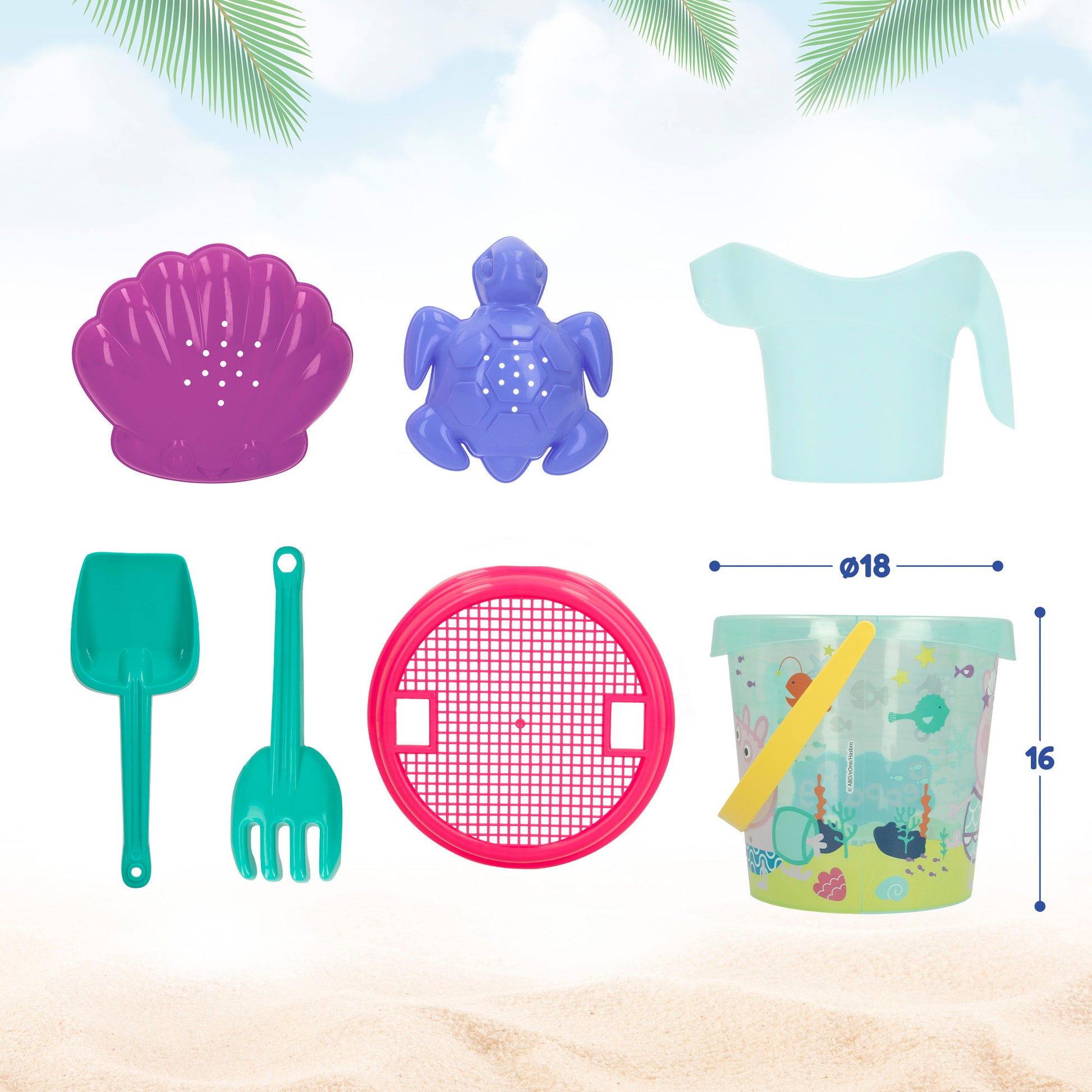 ¡Esta mochila con cubo y accesorios de licencia Peppa Pig se convertirá en tu nuevo set de playa favorito! El set incluye un cubo de playa decorado con ilustraciones de Peppa Pig, una pala, un rastrillo, una regadera y dos moldes de animales marinos (1 en forma de cangrejo y 1 en forma de tiburón). El cubo de playa cuenta con asa de transporte y su tapa es un cedazo con dos orificios para colocar la pala y el rastrillo. ¿Lo mejor? Todos estos accesorios vienen en el interior de una mochila transparente con cremallera y laterales y base de rejilla que, además de servir para guardarlos y llevarlos cómodamente hasta la playa, es perfecta para dejar que caigan los restos de arena y para que los accesorios se sequen si están mojados. Un set ideal para que el pequeño experimente sensaciones únicas cuando está en contacto con la arena y el agua del mar, mientras imagina miles de historias y trata de darles forma jugando con los accesorios incluidos.