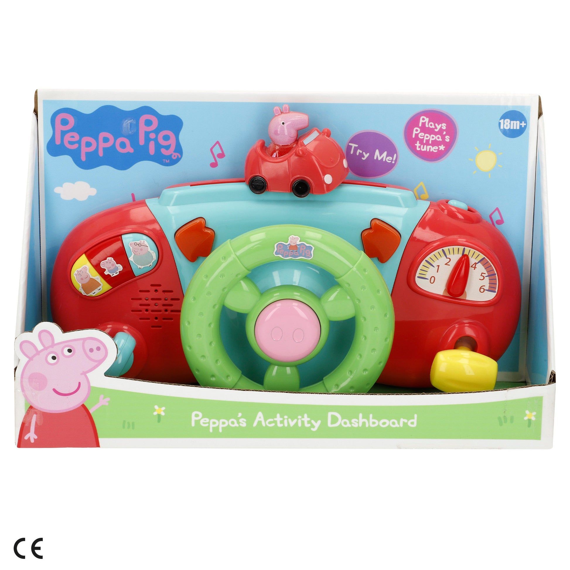 Incluye un volante de actividades con licencia oficial de Peppa Pig, muy colorido, con múltiples botones interactivos que activan sonidos, 3 diferentes voces y la melodía original de la serie. El tablero incorpora elementos como velocímetro, llave de encendido, palanca de marchas y diferentes formas y texturas que invitan a tocar y explorar. Todo está pensado para estimular y entretener durante el juego y los paseos.