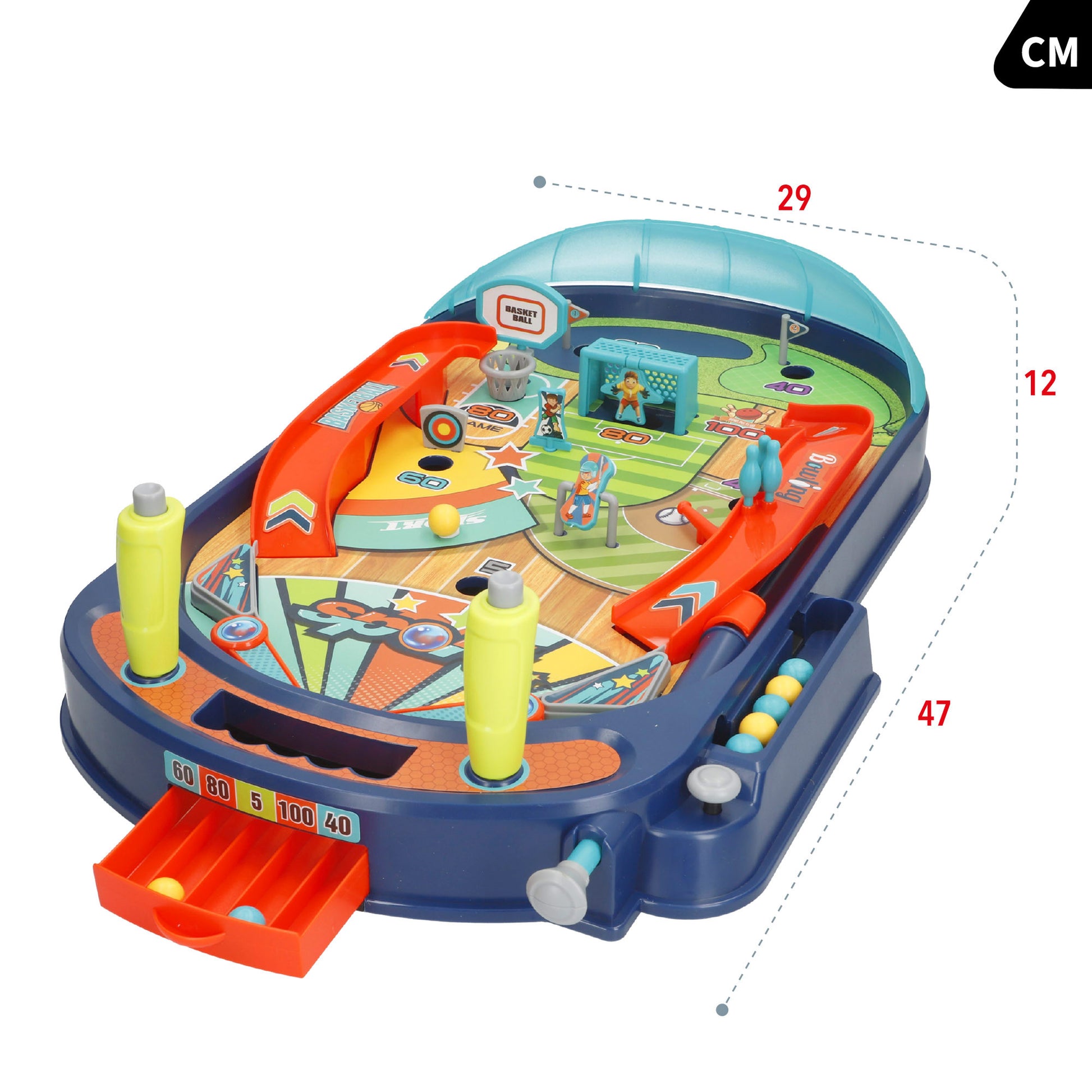 Este juego trae todo lo que necesitas para empezar a jugar: un tablero de juego lleno de sorpresas con flippers que puedes mover con los joysticks, bolas de colores, un lanzador de bolas que dispara súper rápido y un marcador para ver quién consigue la mejor puntuación. También encontrarás un mini aro de baloncesto, una portería, una pista de bolos y hasta un campo de golf. ¡Es como tener varios juegos en uno!