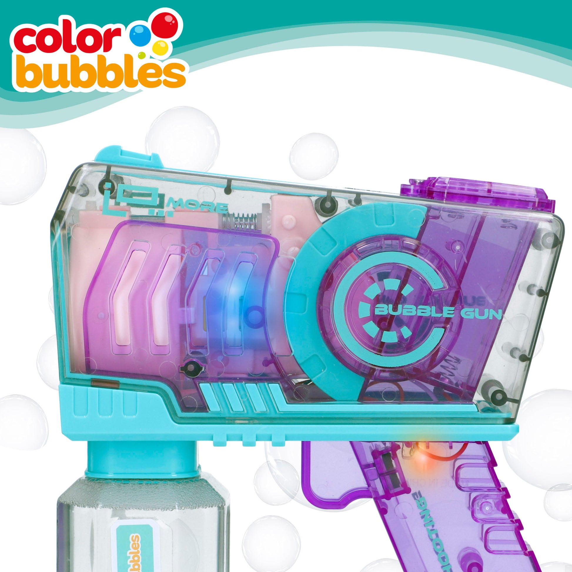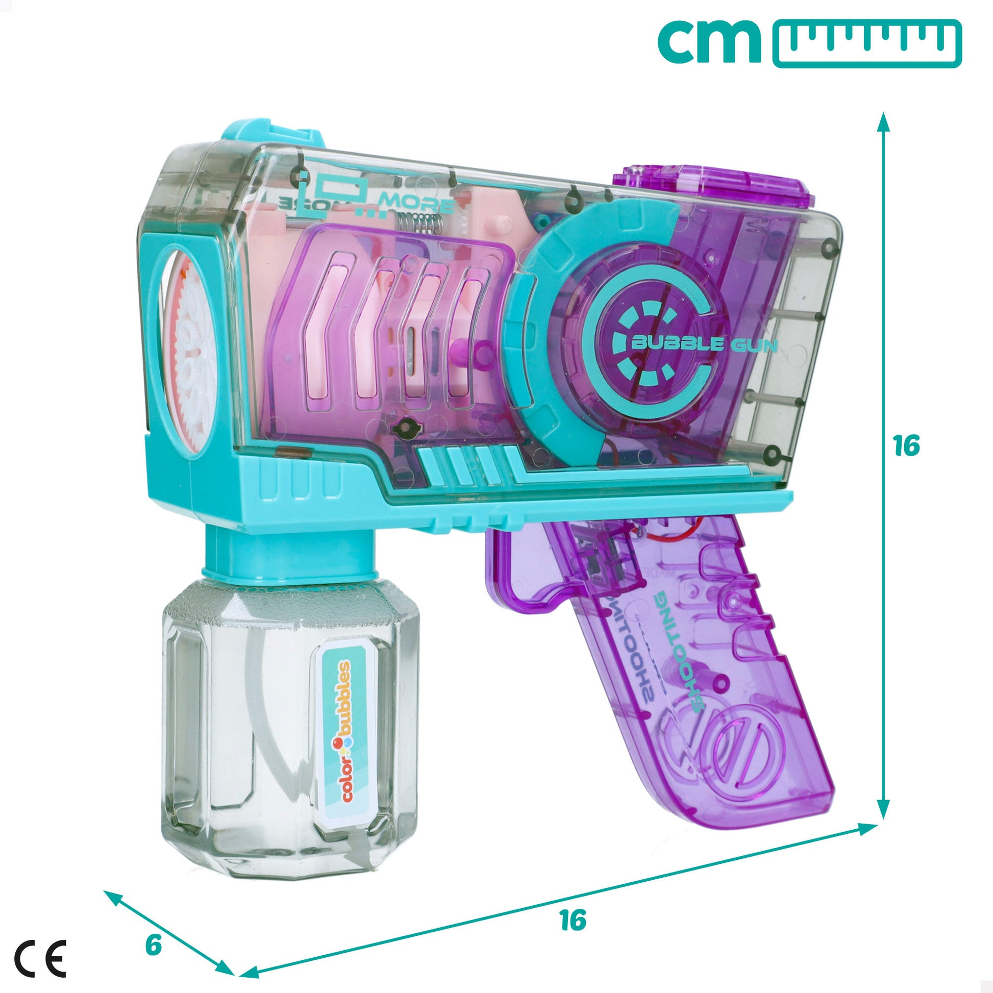 ¡Llena tus días de color y alegría con el pompero Color Bubbles! Es un juguete mágico con un diseño transparente en colores azul y lila con el que podrás hacer miles de pompas. Abre el bote de jabón, enróscalo cuidadosamente en el agujero de la pistola de pompas ubicado en la parte inferior, ¡y listo! Aprieta el gatillo varias veces y empezarán a salir pompas de jabón a la vez que emite una mágica luz que va cambiando de color. ¡Que empiece la fiesta de burbujas!