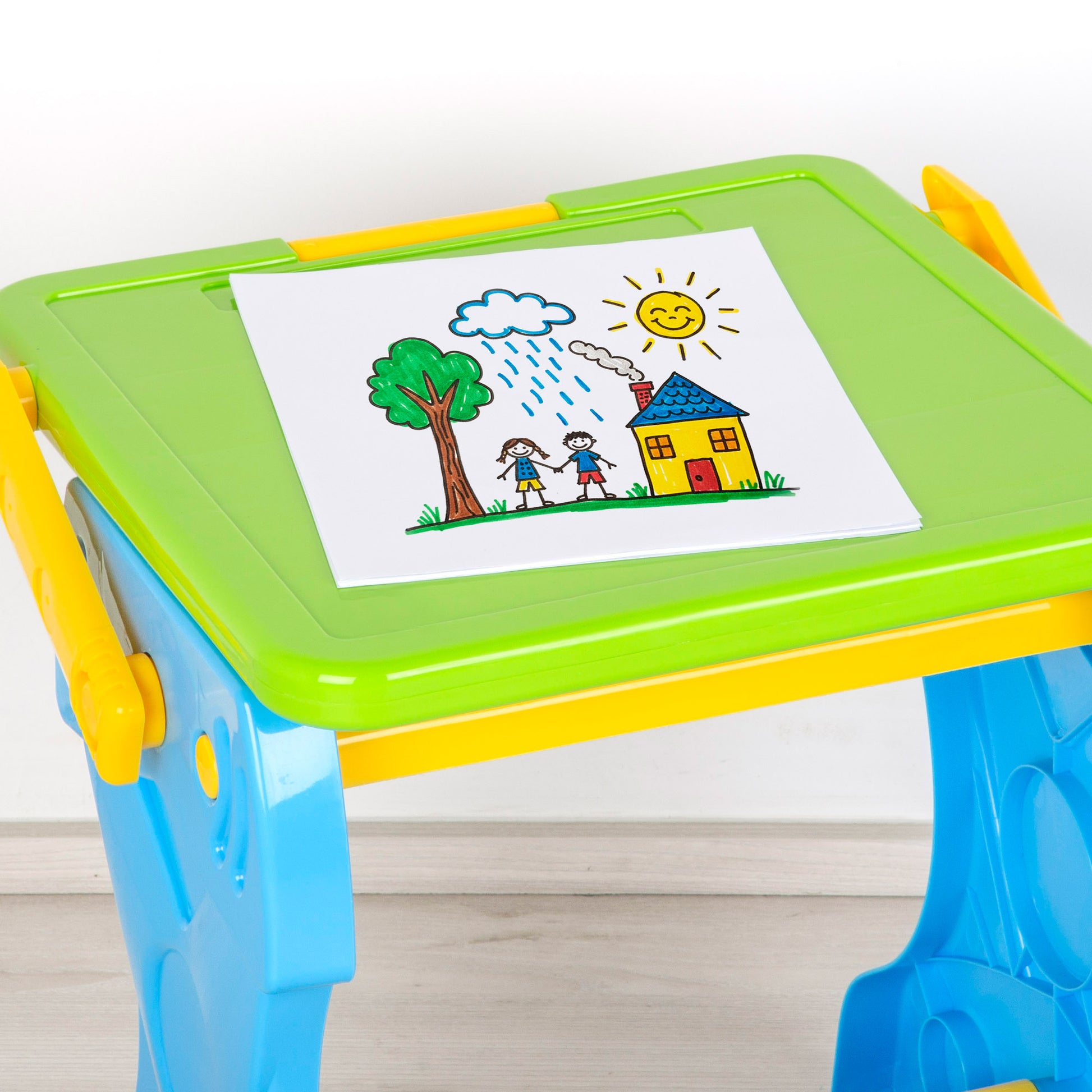 Es un set convertible que pasa de mesita de actividades a pizarra caballete con superficie negra para tiza. La estructura incluye una bandeja para apoyar el material y un pequeño taburete para sentarte mientras dibujas, todo en colores azul, verde y amarillo.